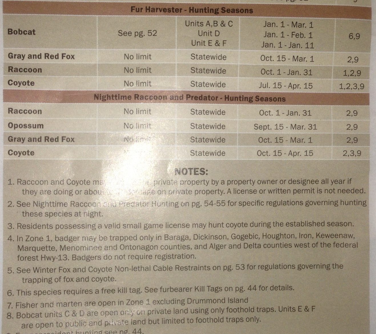 Just FYI, here's info from the 2013 Michigan Hunting and Trapping Digest (Season Dates and Bag Limits). For clarity, Behind the glare, Note #1 reads: "Racoon and Coyote may be taken on private property...if they are doing or about to do damage..." There are 3 additional pages in the Digest regarding Non-Lethal Cable Restraints and Nighttime.
