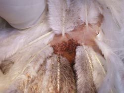 Since mites feed at night, the best time to check your birds is after they have be on the roost for awhile. Look at the base of feathers for scabbing or blackened feather shafts or clustering of mites at base of feathers.