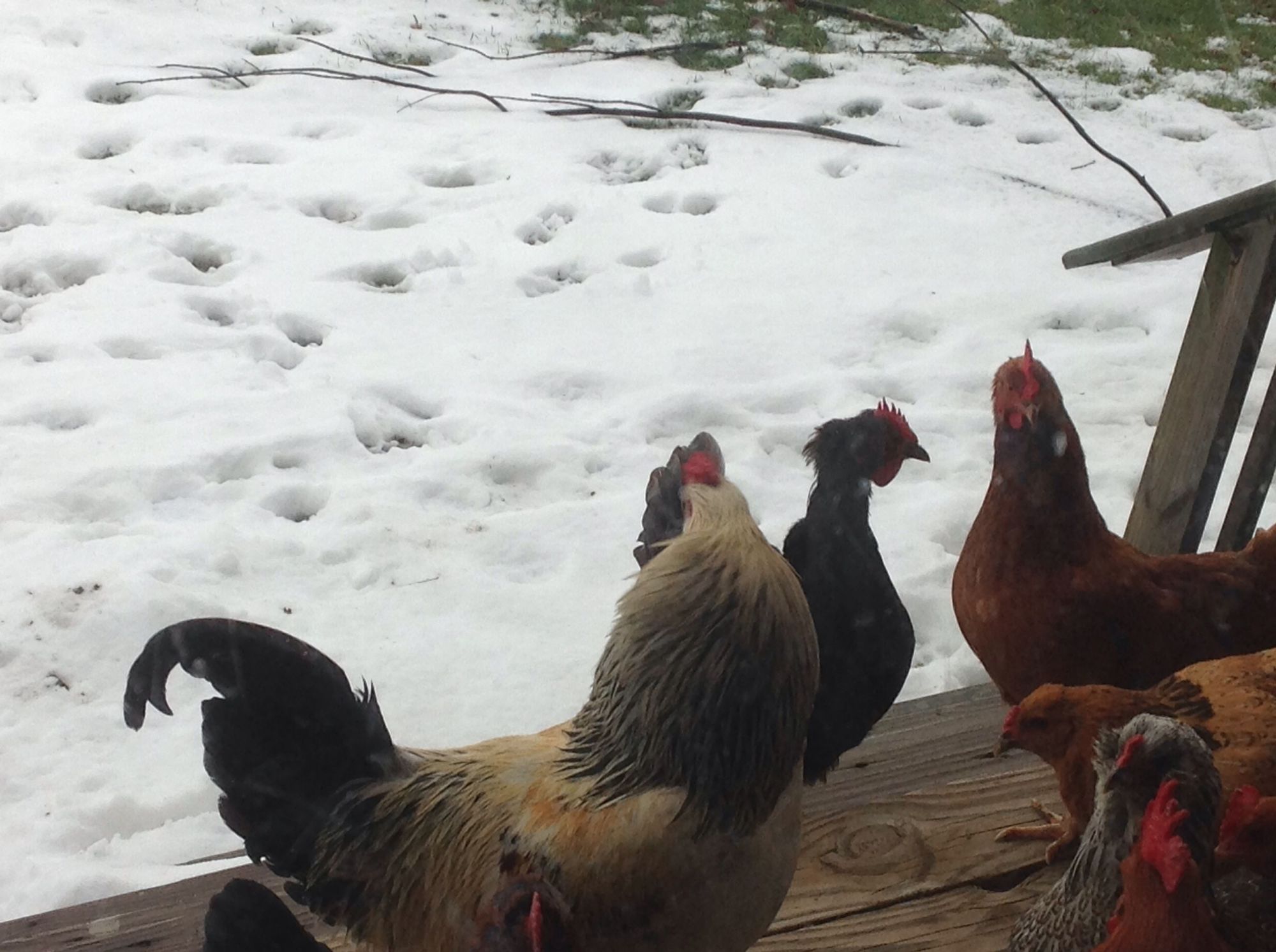 So, birds actually decided to come out today..into the slush. Pretty much right to the deck. Got some molting going on. Poor Maia (BCM). She is starting to look like a naked neck!