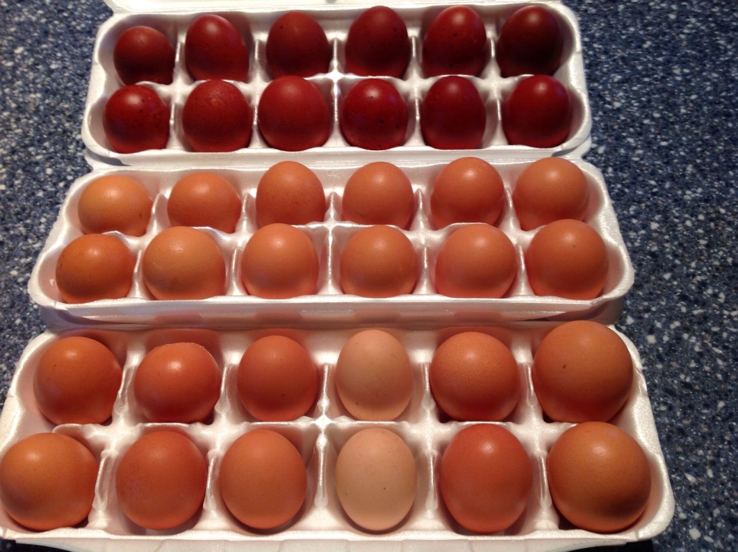 Those are from the Marans that gladahamae was talking about. I have 2 Black Copper Marans; that I got specifically for the egg color. Like glad, I want to get some Olive Eggers (mix between an EE roo & Marans hen); they give a really cool deep green/brown (well, olive!) she'll.