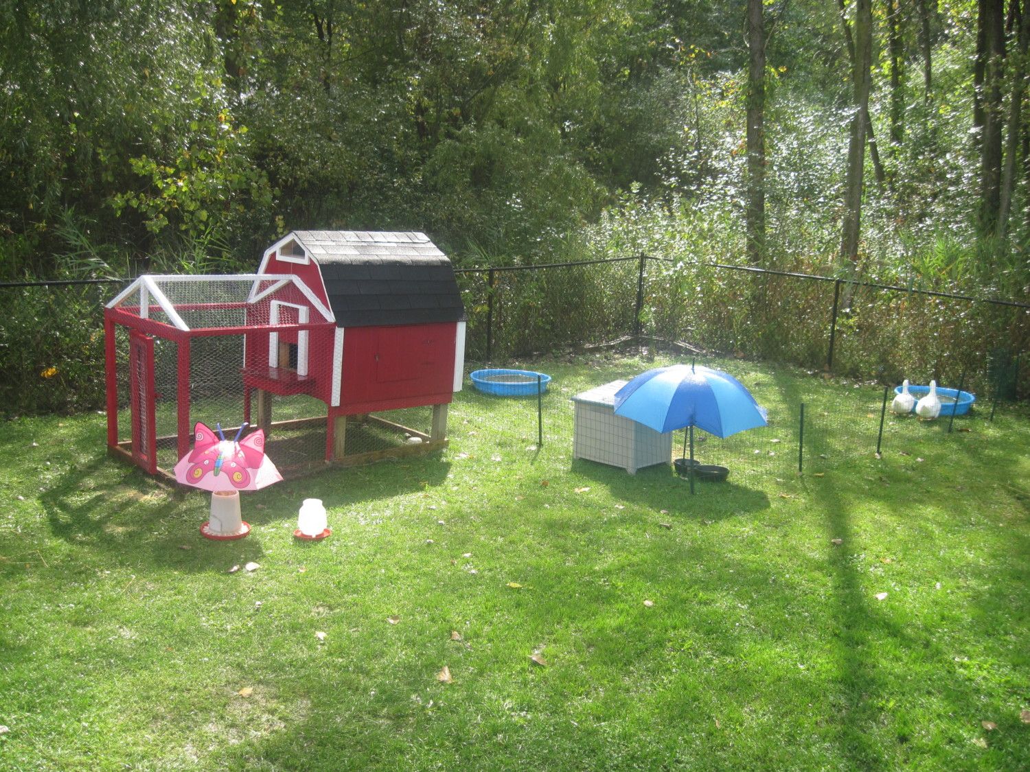 And my new set up.... The umbrellas are just a "quick fix" to keep the feed dry. I have to come up with something better for winter.