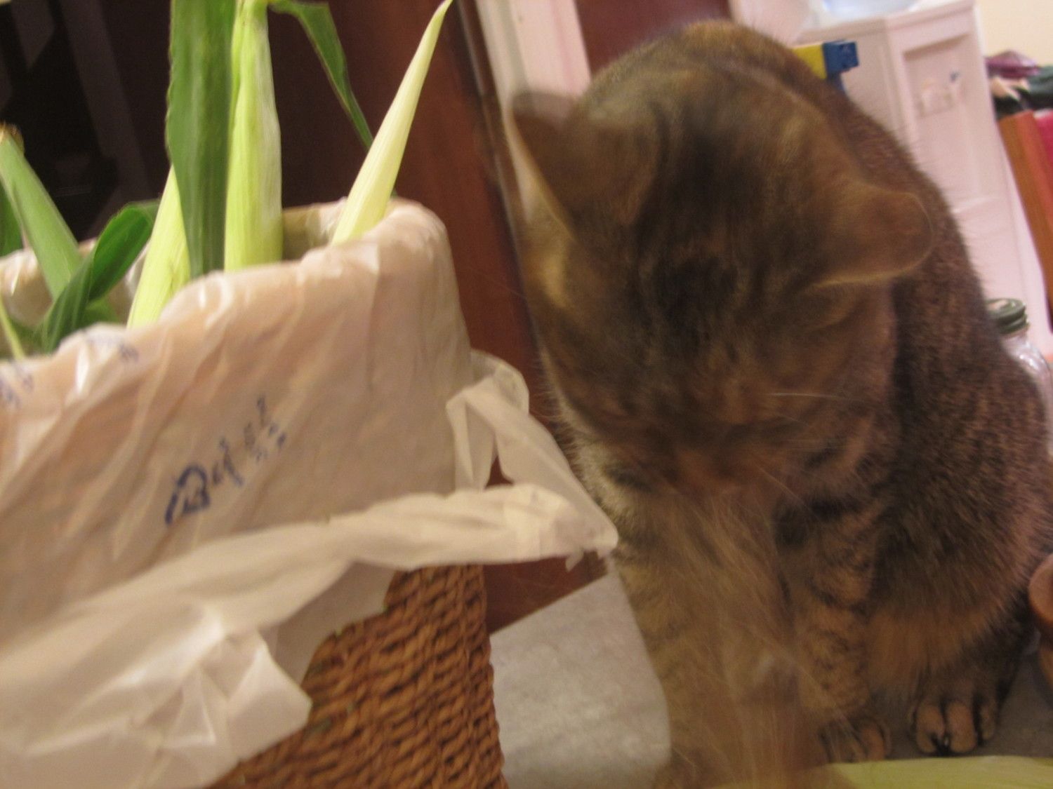The bad news is the animals want to help. While shooing the parakeets, the dogs stole 2 ears of just shucked corn.
