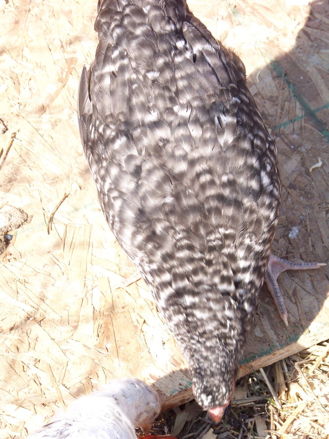 It's supposed to be a cuckoo marans. leg color (which you can't see in this pick) is slate/pink while my BRs have yellow-y legs with black on the front. If that makes a difference.