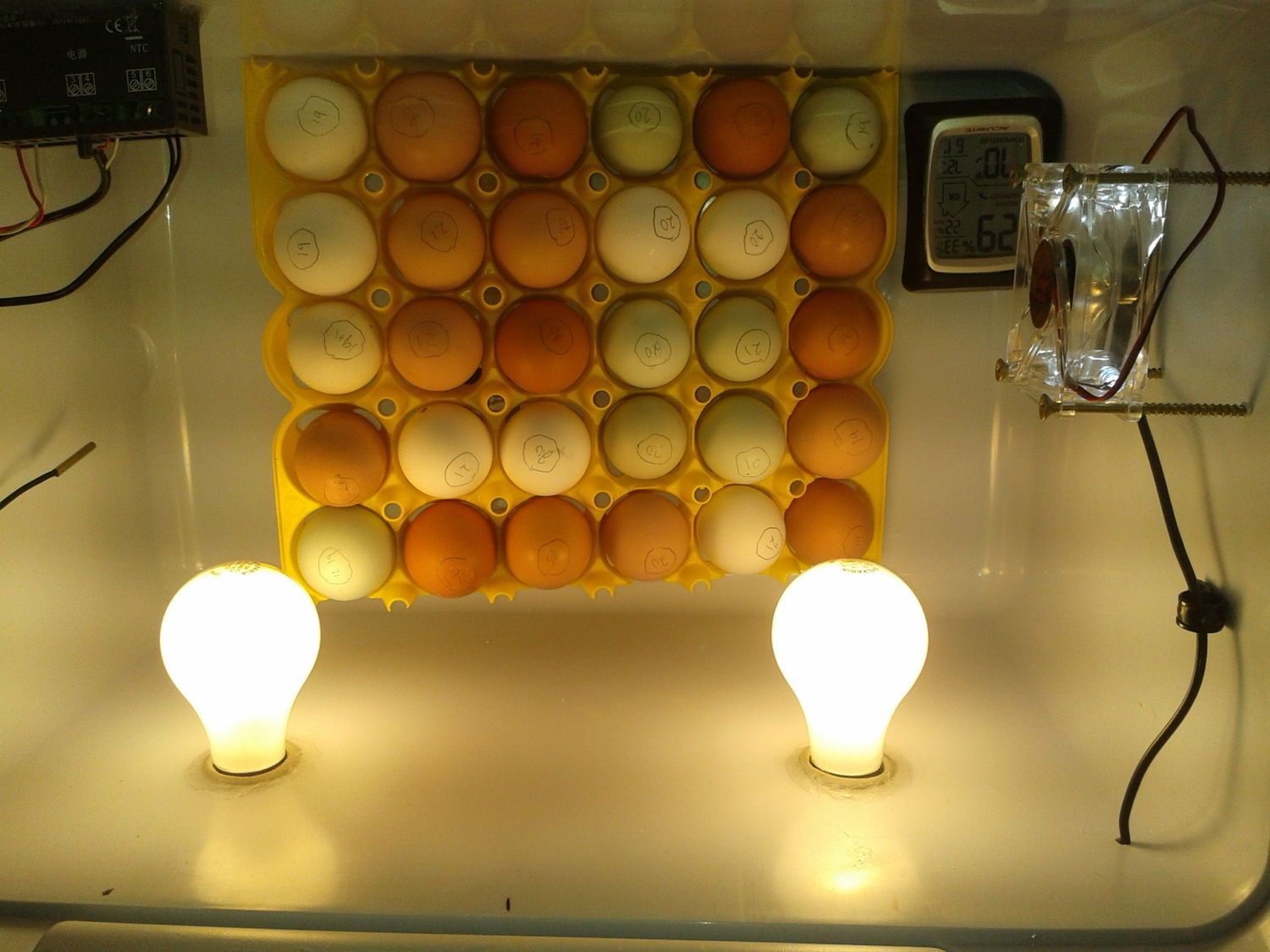 We use a plastic dog house out in the bird run with a pan heater that we set the chicken water can on. Dog house provides shelter for the birds.
