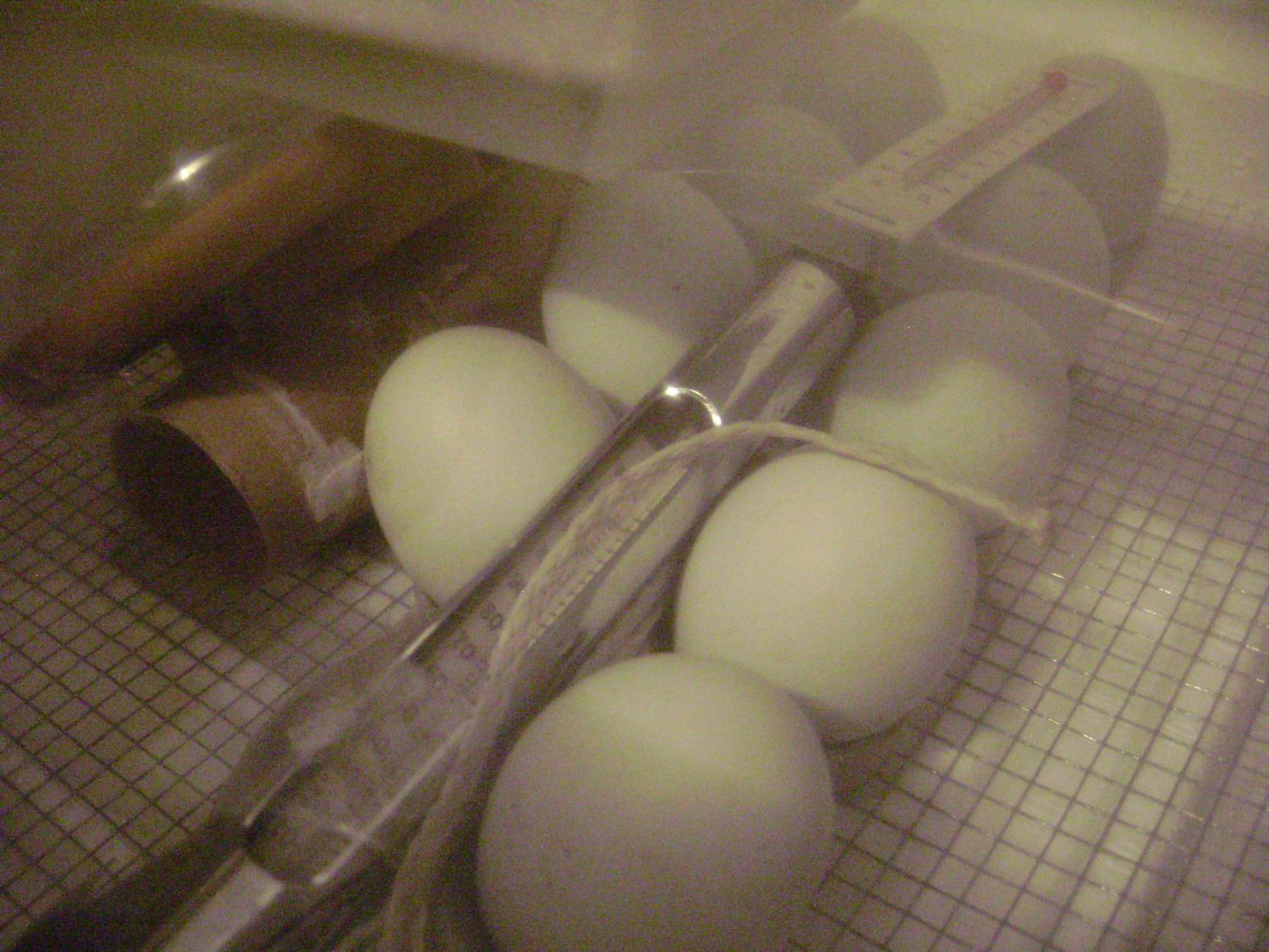 At day 18 i used a hair dye bottle (very clean) to squirt an inch of water into the 2 jars, waited, then squirted water into the big ring. I ended up having to put water into the other ring, to bump it to the 60%, but i didn't get the humidity up the day it should have been, (My fault, for not calibrating my metor correctly) so i was lucky it went as well as it did. The opening in the heat ring is at the left of the eggs, by the brown hydrogometer.