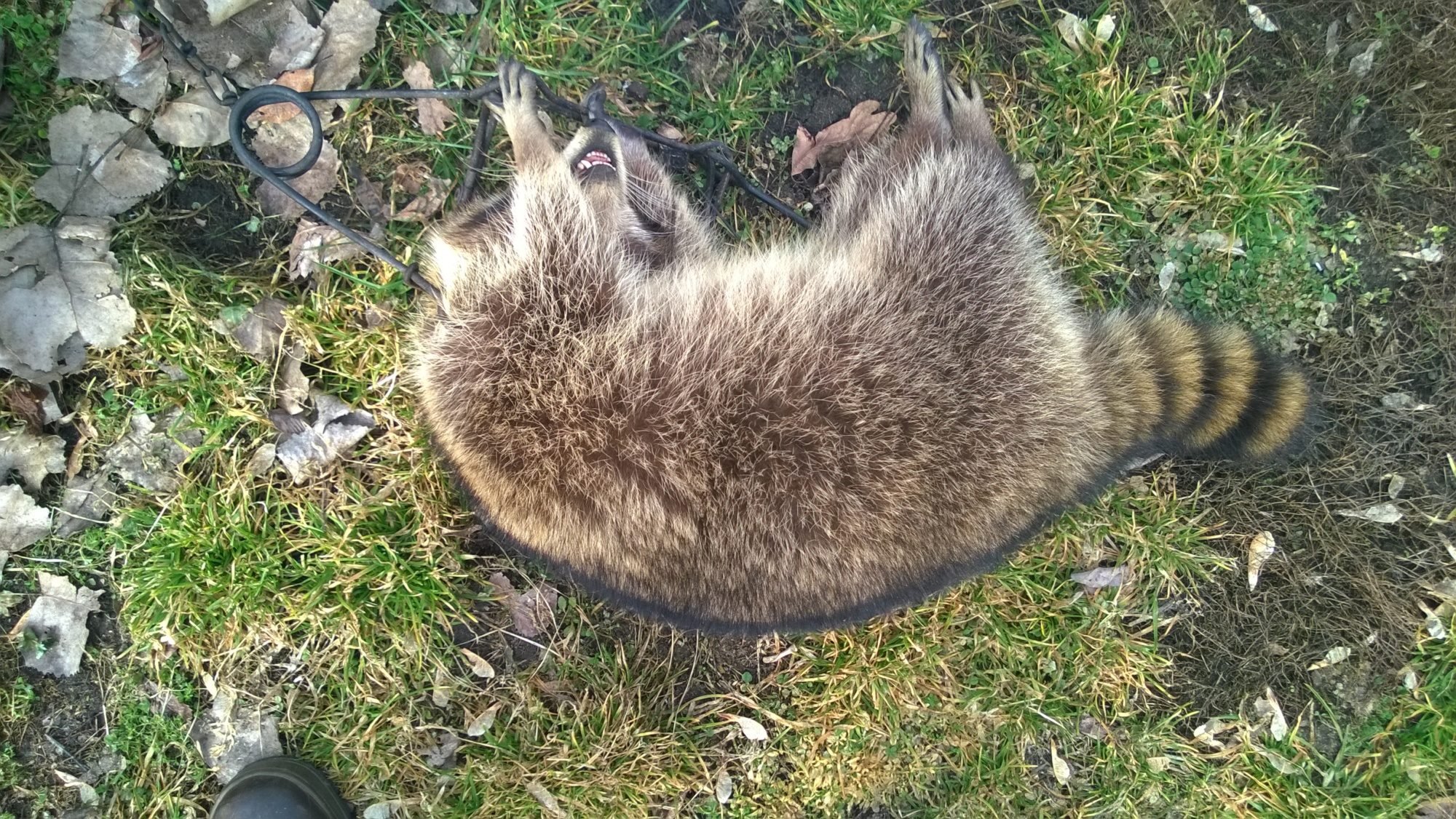 Maybe it's because I'm getting up in years, but takes less to make me happy than it used to. This morning discovering a large coon in one of the traps I've placed around my coops.
