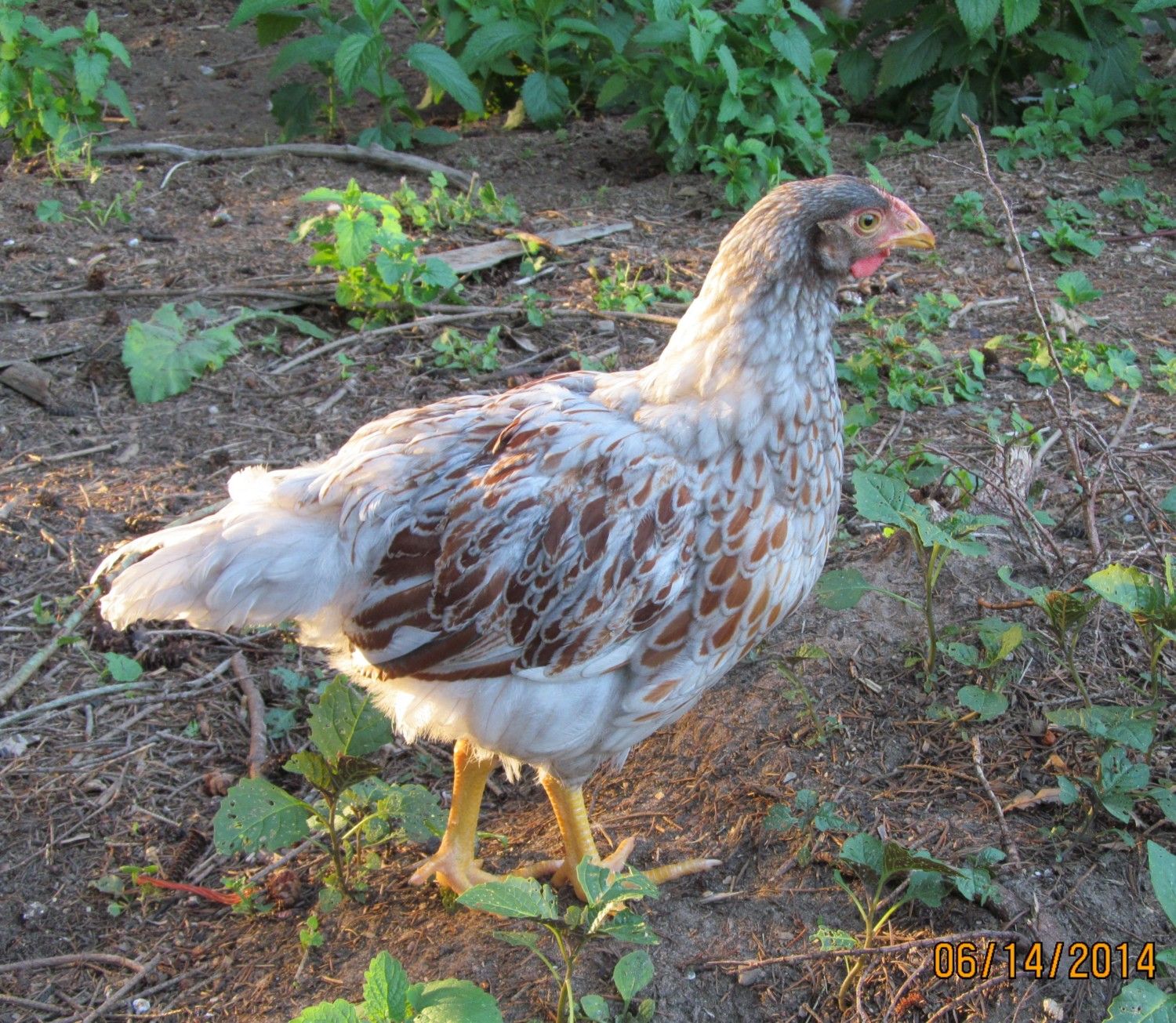 The last photo is of a pullet, same coloring as the rooster. Better pictures soon! Mary