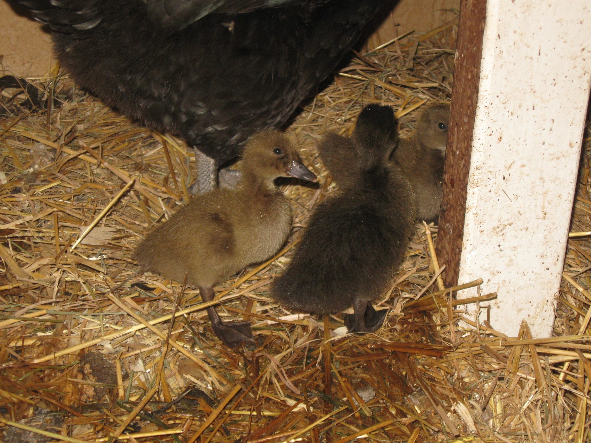 I have a beautiful mottled Ameraucana rooster who, as I was told, came from great lines. I have him with two pretty frizzled females, hoping that I'd get some colorful babies from them. So far, I have hatched 10 eggs from them and all of them are black with varying degrees of white leakage (one is a fully feathered juvenile, the rest are only a few days to a week old but look nearly identical).