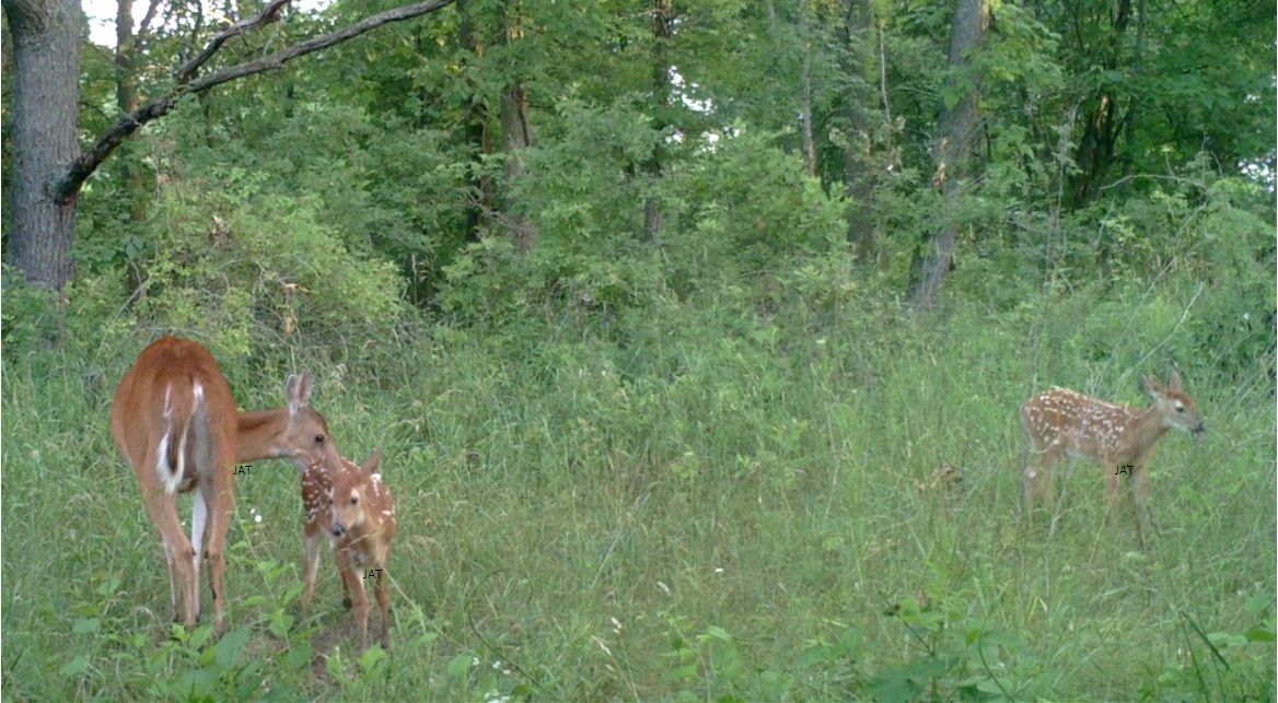 A game camera photo, the doe is a very good mother.