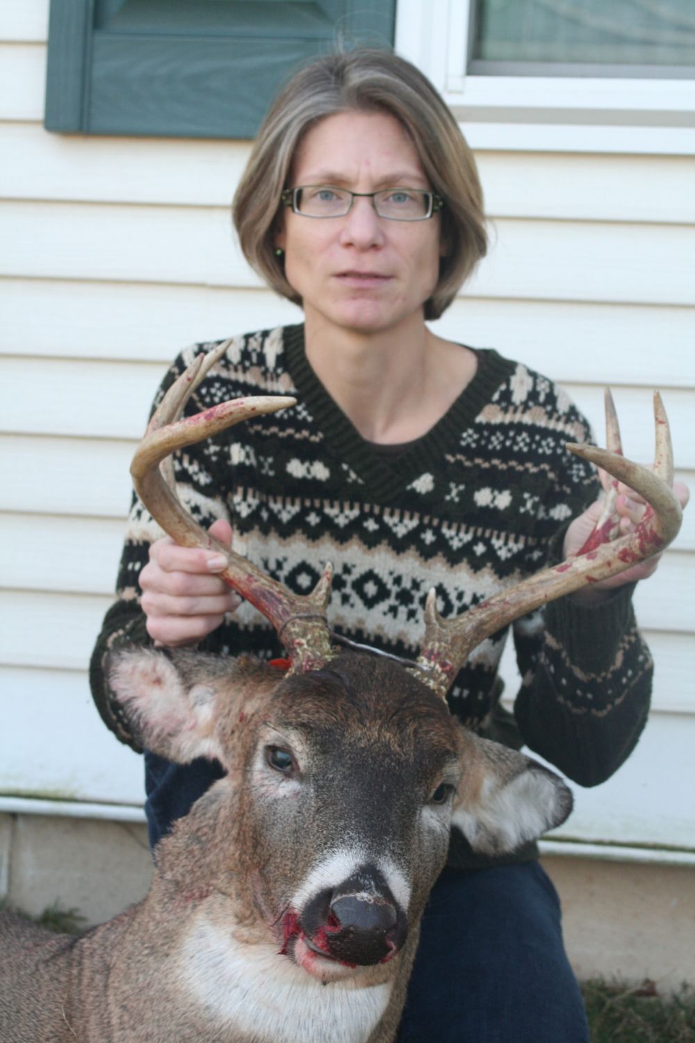 The story is this morning about 8 a doe was in the middle of the field. The buck came out after her. I shot out the basement window with my DH's 308. He kinda walked away and I was sure he was going to go down. He walked behind a pine and I couldn't see him. Then I see him come out into a swampy area. The doe followed him and I watched him breed her in sight of the house but in a spot I couldn't shoot. So I called DH and told him I missed. I was so mad it was an easy shot and close. When DH got home I walked out to have a look and found my deer in the field behind the pine tree. So there were two bucks and I just thought I missed.