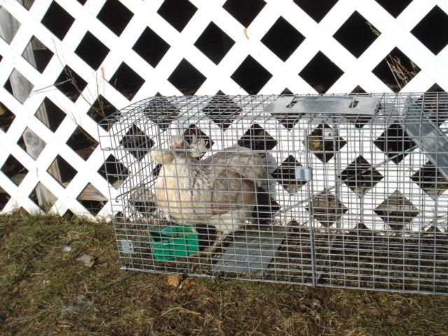 During the day, always be sure to close your livetrap! A chicken may decide the bait inside is tasty. She was only caught for a minute, I was outside and heard the *snap!* of the cage closing.