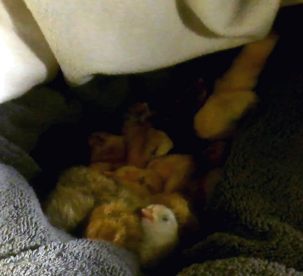 The chicks in bed with me last night. The one in the crook of my knee isn't squished, just stretched out. They were WAY too happy about the arrangement.