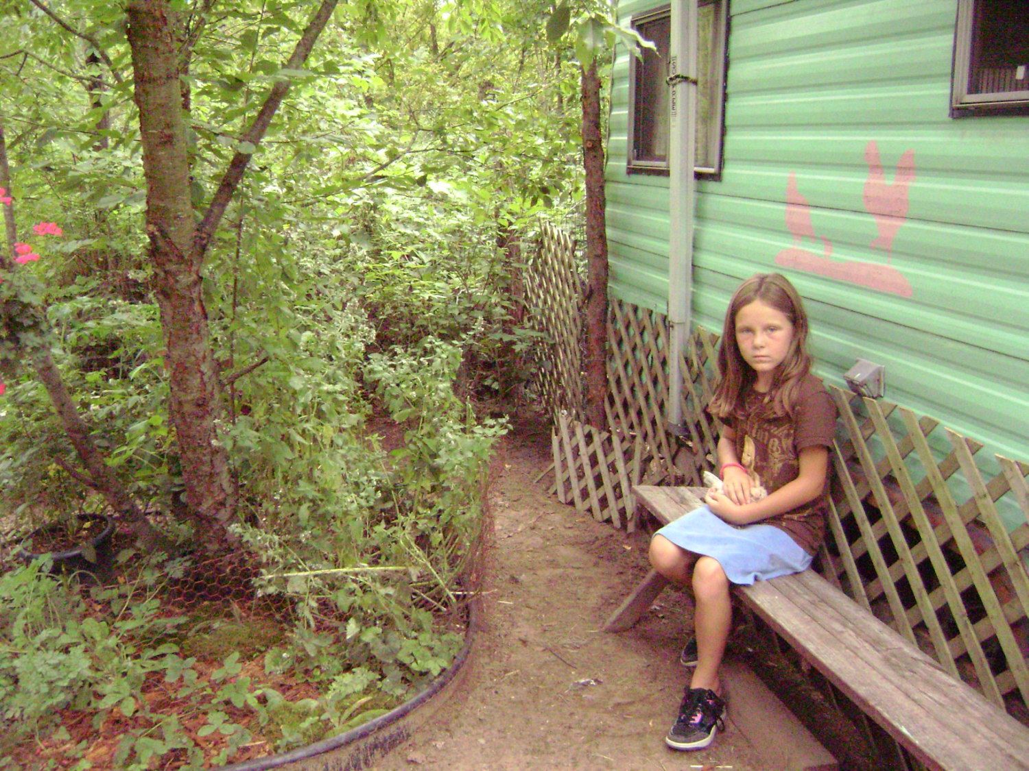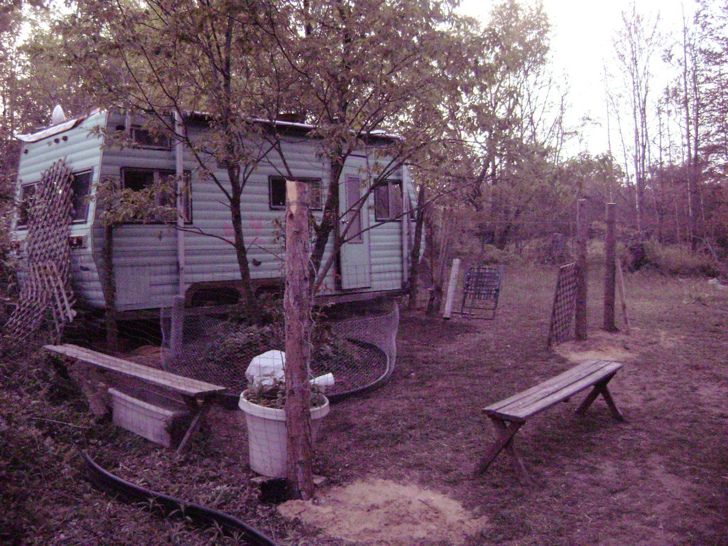 spring last year. One bench was inside the fence to sit with the birds, one bench was outside for visitors so they could watch them or just look at the flowers or whatever. I had roses in the big pot. You can't see the big fence, but it is as high as the corner poles and is galvanized wire. Fencing the tree into the run was pretty, but if i had the chance i'd trade it for a roofed run that would be predator safe, and use a large bush for the visual interest! Or a mini tree of some sort. Top left by the camper the corner has scrub brush too, that i kept. Birds like to use it for cover. I think allowing for scrub brush, or some kind of sturdy bushes/ plants that they won't eat in the run is a good idea too. Space is good, but my birds seem to enjoy the nooks and crannies better than a big square.