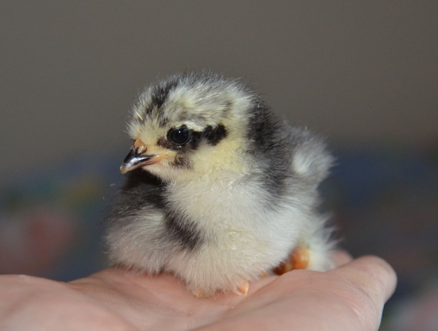 Here is my most friendly chick. She comes right to me when she sees me coming. RUNS! She's the one named Hawk... She sure liked being held, then decided it check out my glasses, see if she could get under my chins...