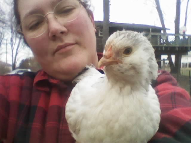 Here is my most friendly chick. She comes right to me when she sees me coming. RUNS! She's the one named Hawk... She sure liked being held, then decided it check out my glasses, see if she could get under my chins...