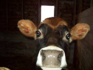 So my friend Theresa, through her FFA connections, knew quite a few dairy farmers. I researched breeds and decided I wanted a Jersey. After school ended for the summer that year, we drove around to several farms and made a deal on a heifer, maybe four weeks old or less. We arrannged to pick it up in a few days. Now Theresa owned a Brown Swiss heifer, and she'd bought it when it was a few days old. She'd transported it on her lap inside of a burlap sack. She said we could do the same with mine--even though it was older, it was a smaller breed so it would still work. I remember feeling a little skeptical of this, but hey, she was the expert, and also the president of the FFA, so off we went.