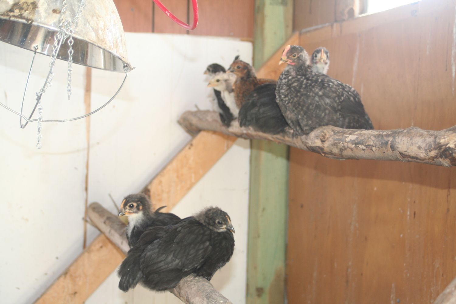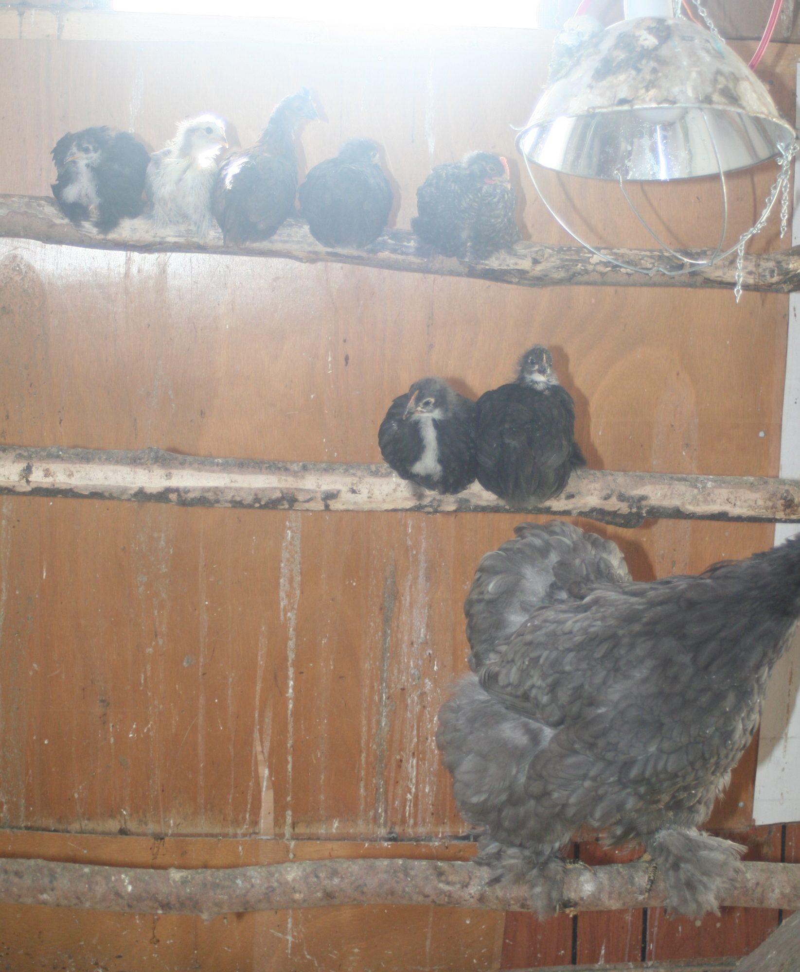 Here is what I found in my big coop yesterday. Mom brought her babies in for a visit. First picture you can't see so good because of the sun. In the second look at the middle top guy - he has a little mohawak! And Spot who is on the end is most certainly a roo.