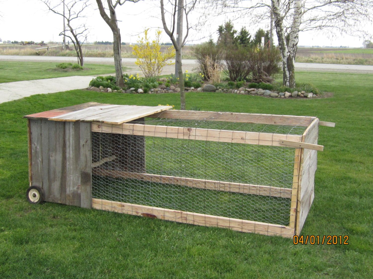 1st tractor: 2x2x8 good for about 4 hens. Has perch inside and hinged latched door on the enclosed end. It's barn wood covered.