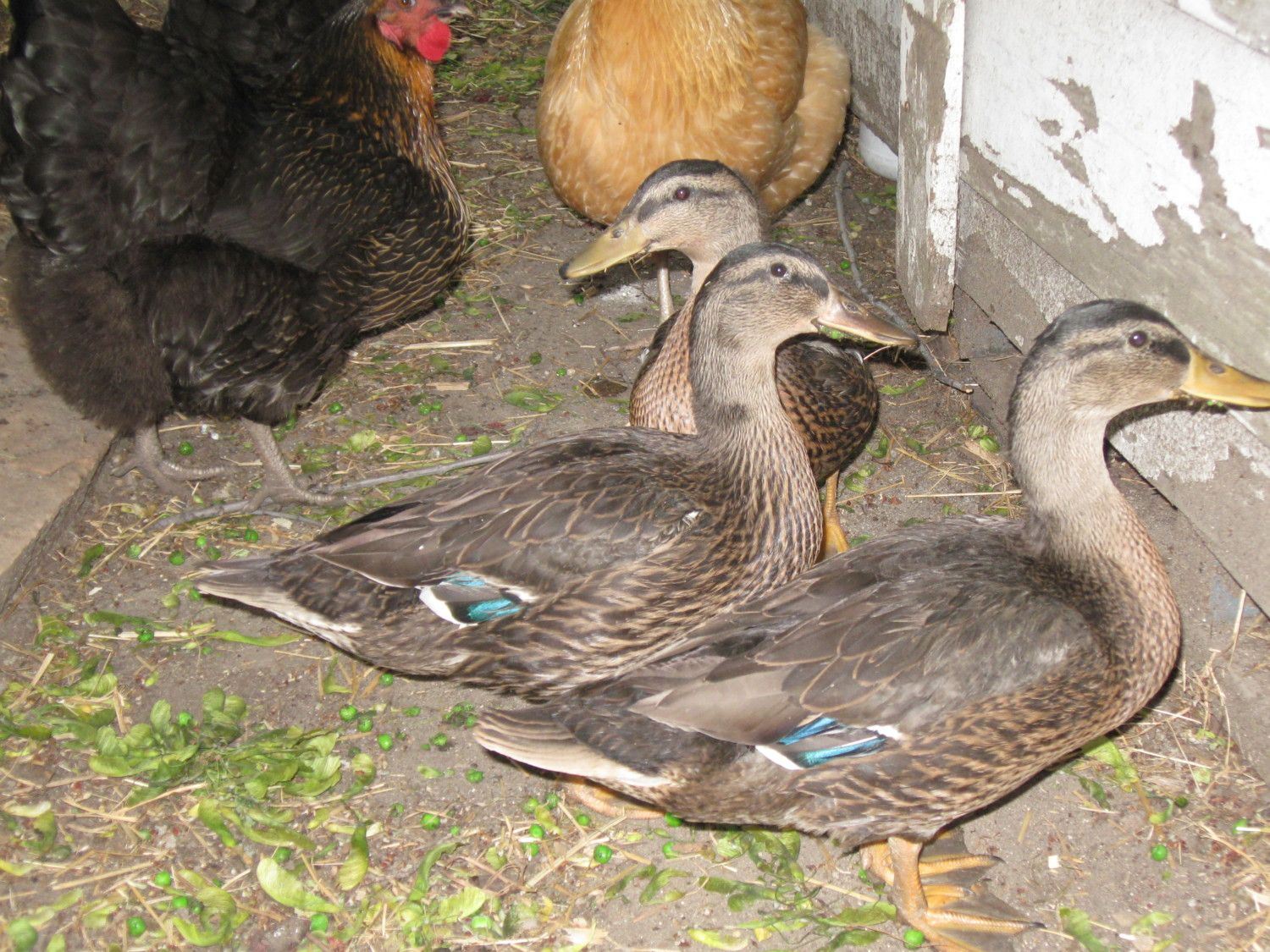 All of my new chicks ventured outside today. They and the ducklings come out in fits and starts. The little mallards seem to like to be with the big hens. Here are a couple of pictures: