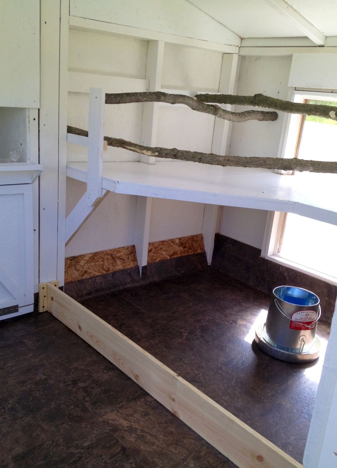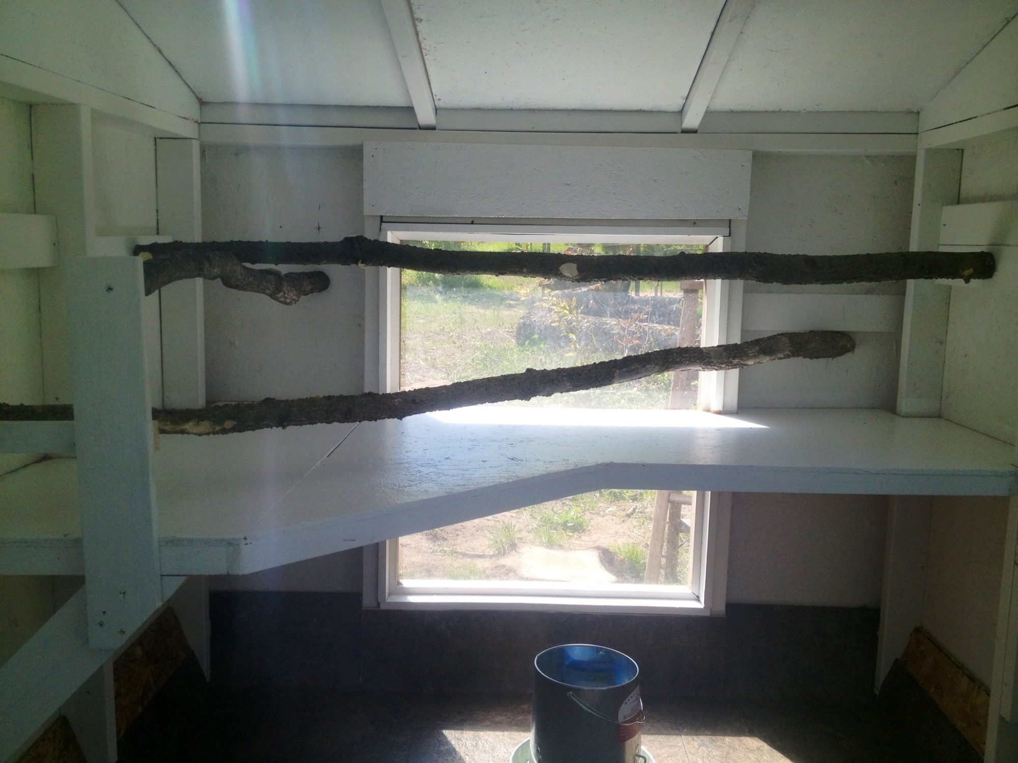 Then to secure the covered run and put up the girls 50'x60' open pen! Here's the inside roost area. I told you it was a little non-traditional. There is approximately 17 feet of roost space and DH built that awesome poop board under the whole thing for me. I'll hang the feeder and waterer under the poop board.