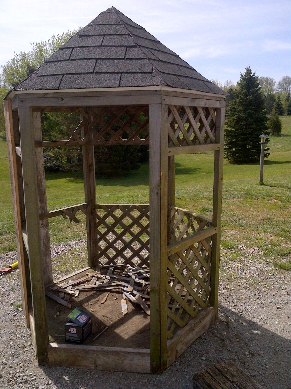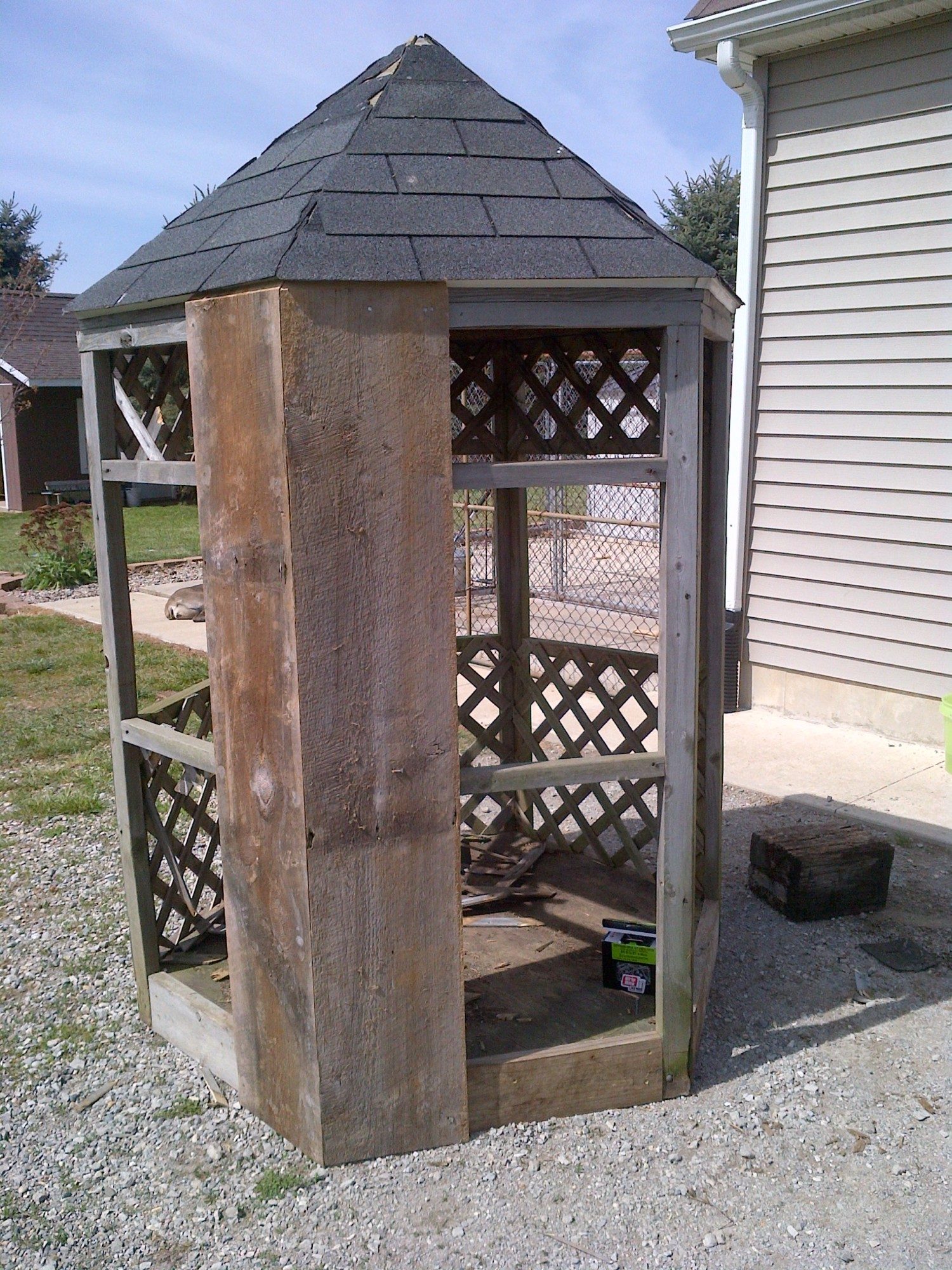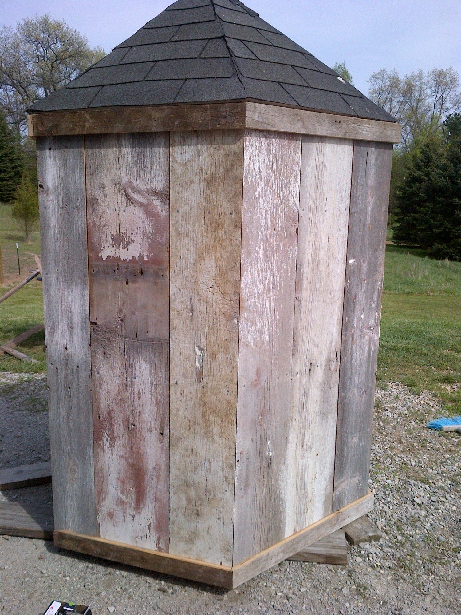 We spent all day Sunday working on converting the little gazebo into a coop. We have to finish making a door and I'm going to get some plexi to make windows for it and I need to finish the roof and stuff on the interior. I'm going to paint it white inside and outside, I will probably stain it though I hate to lose the old weathered look. I wonder if a deck sealer would work. I'm putting a small vent on the peak, but not sure yet where I'm going to put some vent holes. should vent holes be near the top or bottom of the coop? (I Bought DH a table saw to make it easier to rip the barn boards... we needed one, but it seems the best way to bribe him to do projects I want to do)... of course, now that we have the saw, I can do some of these things on my own!! Here's some in progress photos.