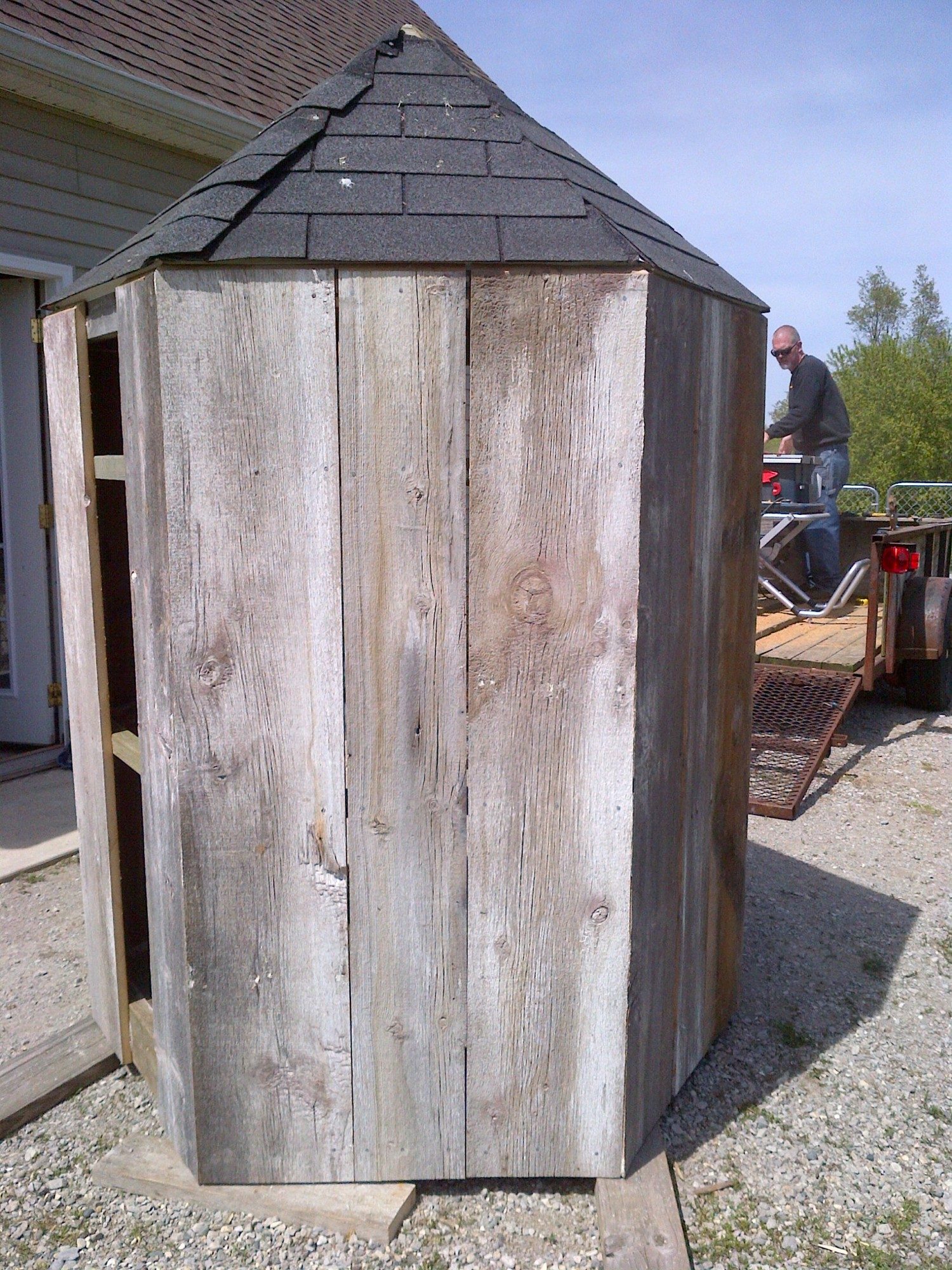 I added nailer boards at the bottom, tightened everything up and removed the lattus. We put up barn boards at each corner section. After we finished the corners, we cut a board to fit in the center. Once that was finished we added the trim at the top and bottom. The baton boards covered the cracks I finished covering most of the roof in the dark.... Still have to put something on the ridges and a vent at the peak to finish.