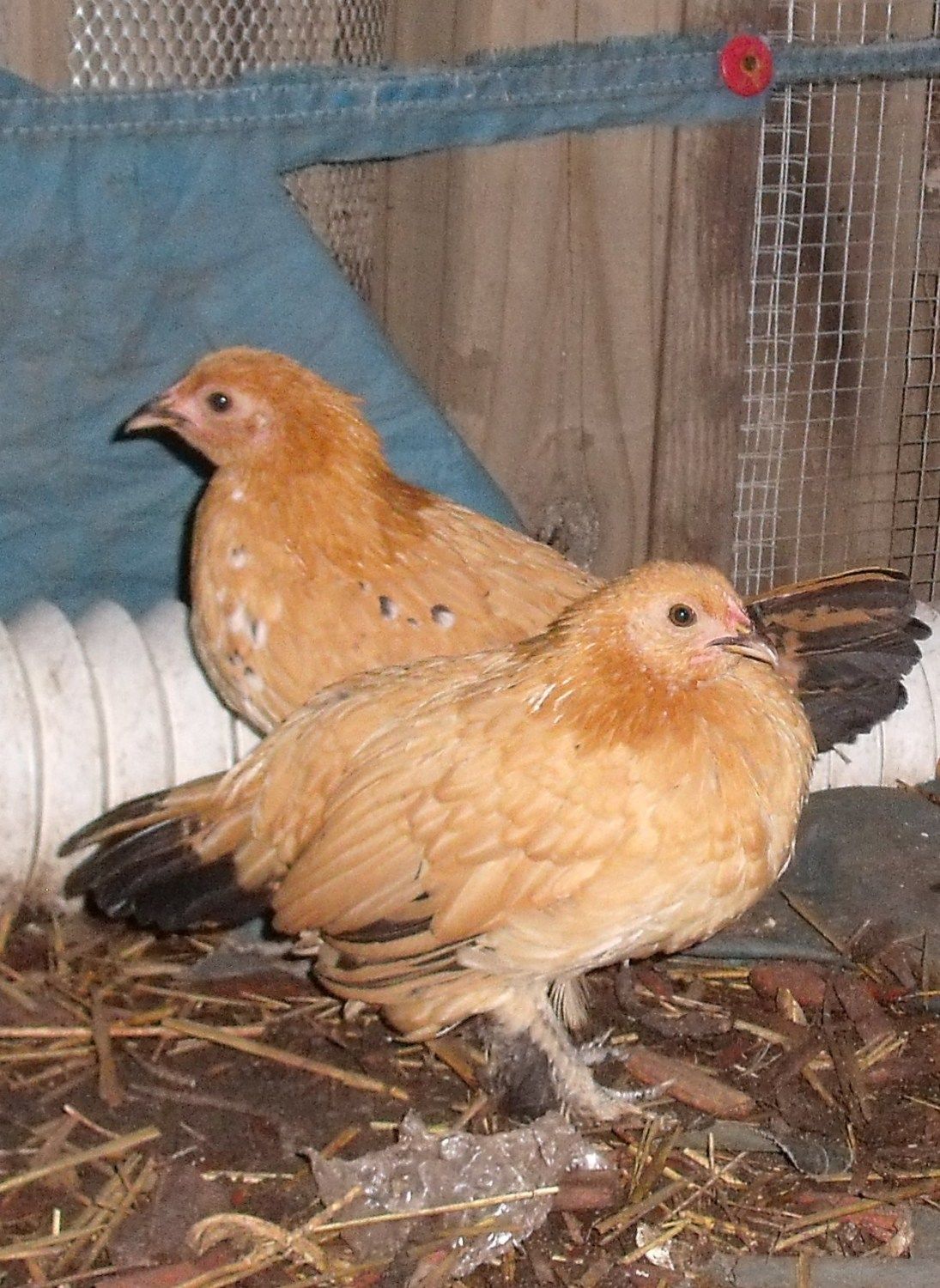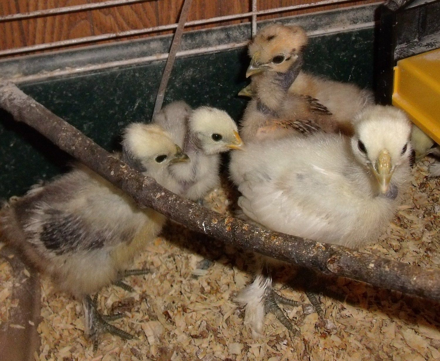 I tried to get pictures of my d'uccle crew..and I am known now as the BIG BAD CHICKEN SNATCHER..so, they wouldnt let me get near. Here are bad shots of them: Chickmates shirt in the background..and I forgot I counted, they are seven and a half weeks old.