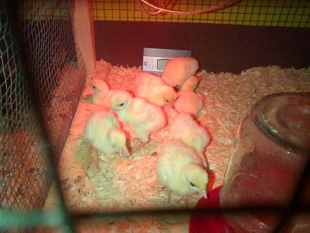 Skatter has taken to Mommy-hood just fine. She's realized that those little creepy crawly things under her are what comes out of the eggs. She hasn't pecked a single one since the first hatched. Its doing fine too. She's moved them out of the nest box/cat carrier right next to the food and water, so I took the carrier out so they'd have all the room in the broody box. She has one super tiny little black one that came out of Skeeters egg. The other three, all look like chickmunks. All 3 have faverolle beards. I am not sure which one is the faverolle chick though. Even though 2 are FAV/GLD crosses, they came out light, look like faverolle chicks. OH, and they all have 5 toes on each foot. The chick that got a bad start is thriving as well.