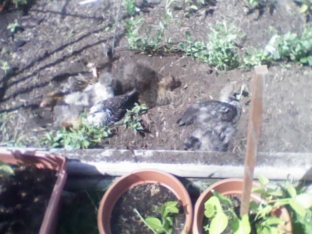 Anyway. I weeded the veggie patch early this afternoon and then took the boys to DeAnna's Playhouse. We get home from that, collect the second round of eggs, since half my girls lay in the mid afternoon, and head on in the house to eat. Jace goes back out to go adventuring in the yard, comes running back yelling that I just had to see what the chickens were doing. SO, I go out, he points in the direction of the veggie patch and there is a chicken throwing dirt... I was like NOOOOO!!! And I get over there, Roger and 6 of his charges are dust bathing in the only spot that has no edible vegatatoin They were all together in one great mass of dirt and feathers..