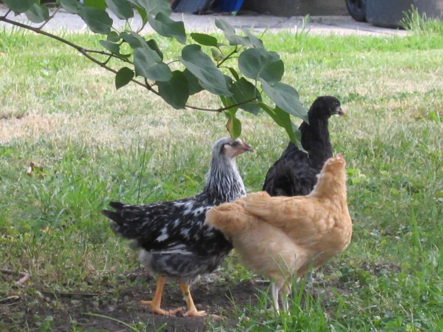 I've mentioned here that our Orpington is probaby a rooster. Now our SLW is on the watch list. "Her" wattles are starting to come in and the face turned red this week. I've read that's kind of normal for Wyandottes, but I'm holding my breath. Oh, gurus of chicken sexing, I would like it very much if all of you told me that Hazel is probably a hen. Does this photo capture the necessary features? Her tail feather were more full, but they've been plucked out. As a result, they've been getting extra protein via yogurt this week. Here is our trio yesterday, at 7 weeks old.