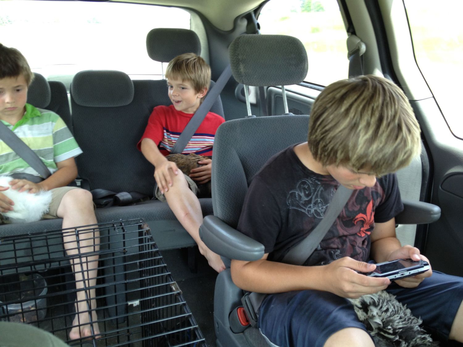 M2 - I'll have you know that Isaac, the middle kiddo, claimed the uggo. He calls it his vulture chicken and named it Drako...It's probably a boy so I'm sure the name will be fine. Lol Drako rode home on Isaac's lap and the dark brown chicken rode on Austin's lap. They are in chicken love.