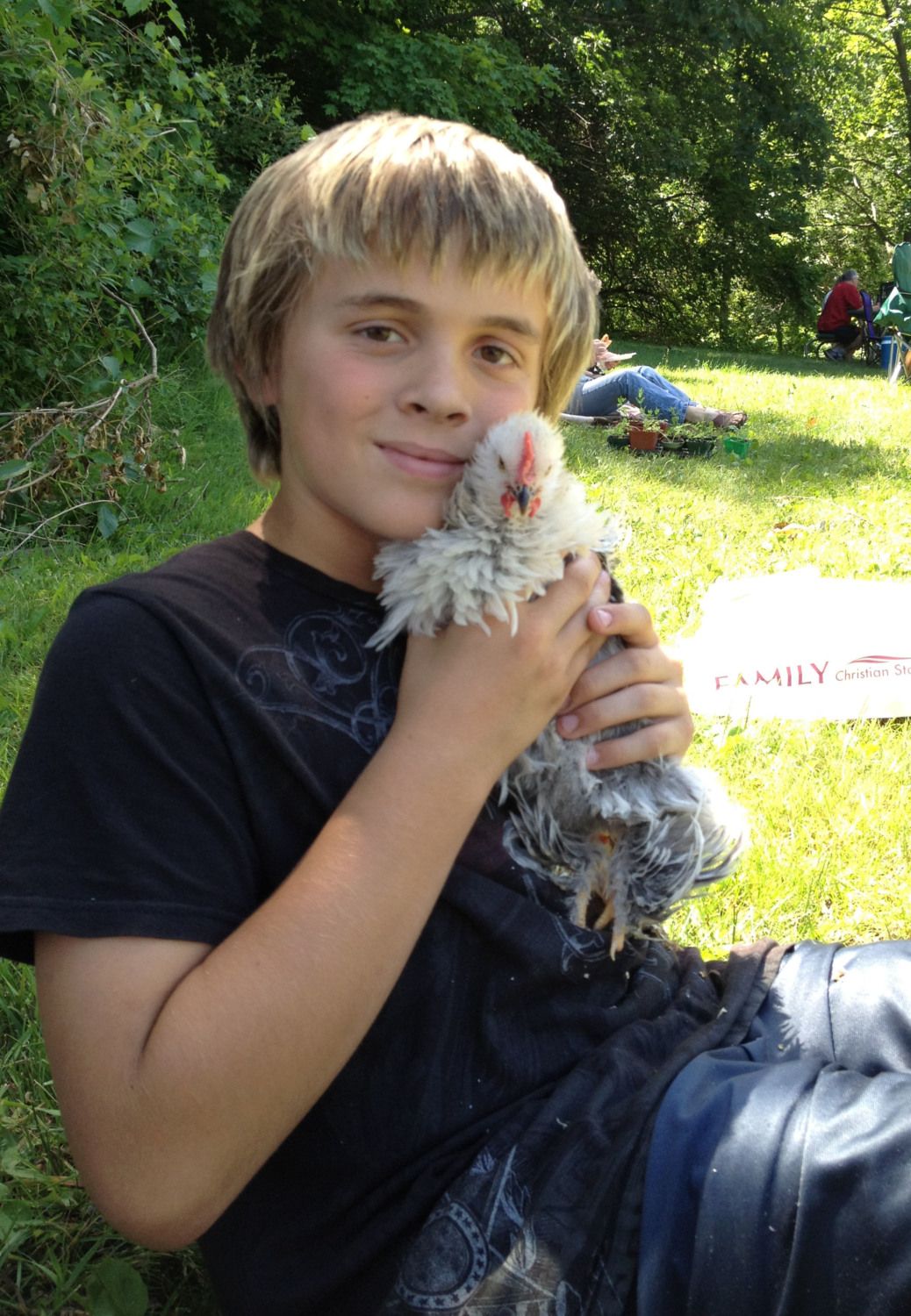 Your Son's chicken is so funny it's so gentle and furry lookin'.