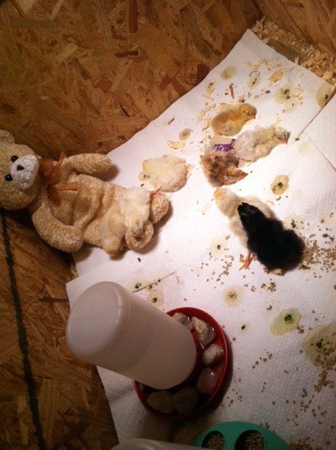 Can we tell which on is Dino/Dina? Look at how small he/she is compared to the others! The lavender beside him/her was the other one to hatch the day after Dino/Dina. Sure is a strong one, considering it's size. He/she still has matted feathers on the back of it's head and neck, too.