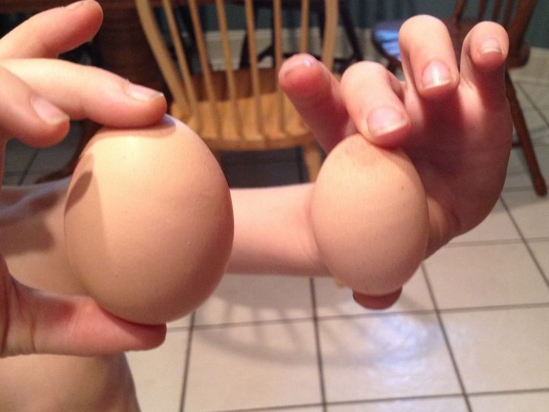 Shown with a normal egg for size comparison. Her's are the top two in this bottom pic, and the middle one has swirly appearance in the shell.