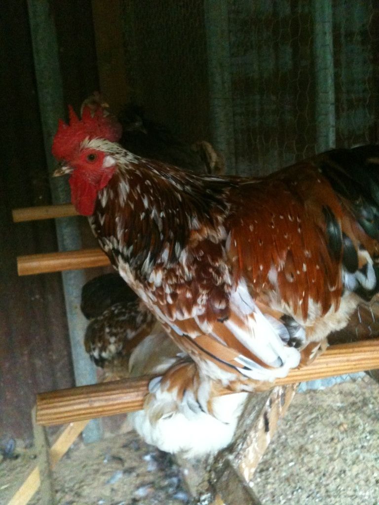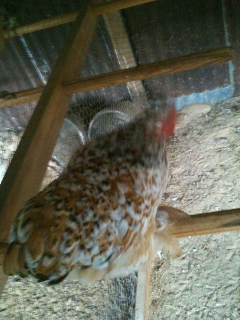 Hen number two. Same age as rooster and hen number one. I apologize for her sitting on the pole. She refused to stay on the ground.