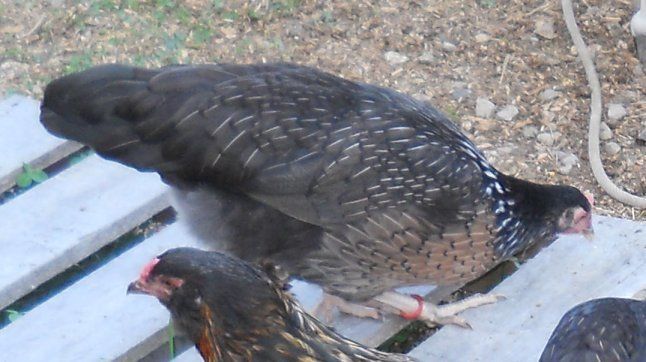 and another dorking girl who carries 2 different melanizing genes, Cha and Ml. the Cha gives her a black head and Ml makes a more definite black tip to her breast feathers. the other dark tips aren't as visible, since her feathers are overall darker because of Cha. (she's also silver based, rather than red like the above girl).