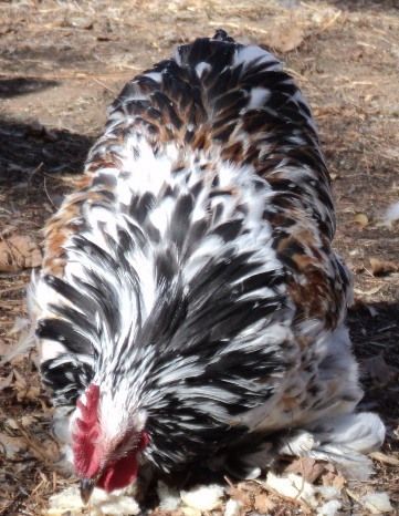 I need to move a roo or two and one of them will be this blue mille fleur cockerel. He's now breeding and I set a few eggs to check if he's successful. He's growing nice shape and may even be good for those working on calicos as he has excessive white.