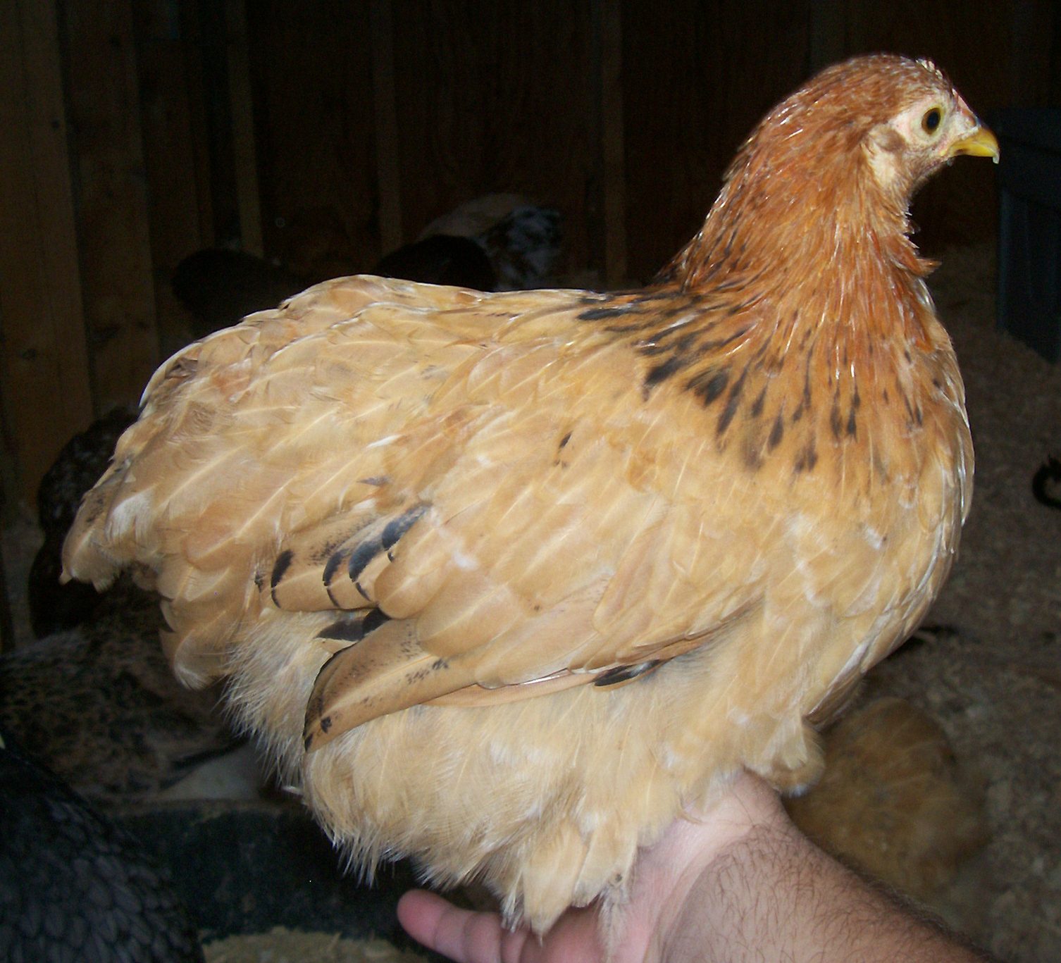 Erin, Byron's babies are varied. Over Bridgette, the BC, or more black tailed buff pullet I got with him, the chicks come out looking BC with sporadic chevrons or white tips. With Mildred, the more white of the original girls I got from you, I have gotten calico chicks. With Millie, who is calico but not nearly as white as Mildred, I have gotten chicks like Junior. Here's what I mean: