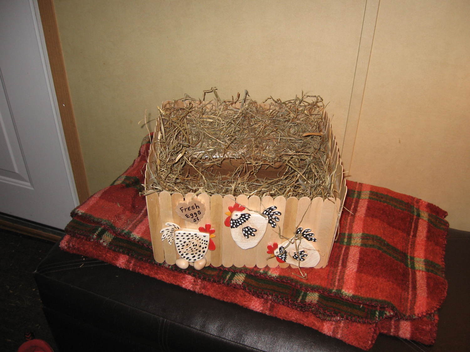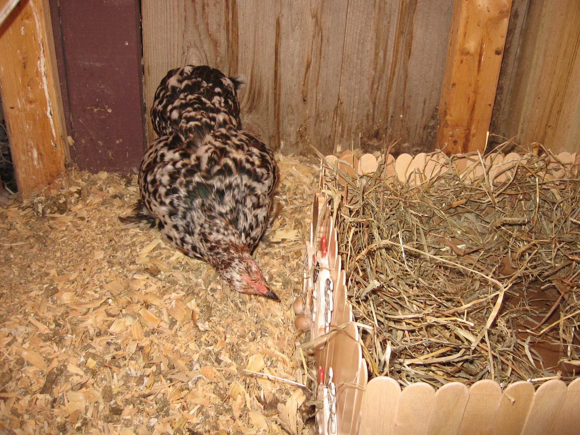 I was bored one night and thought lets make a nest box with a slanted bottom and a ledge to hide the eggs, just in case we do have an egg eater,