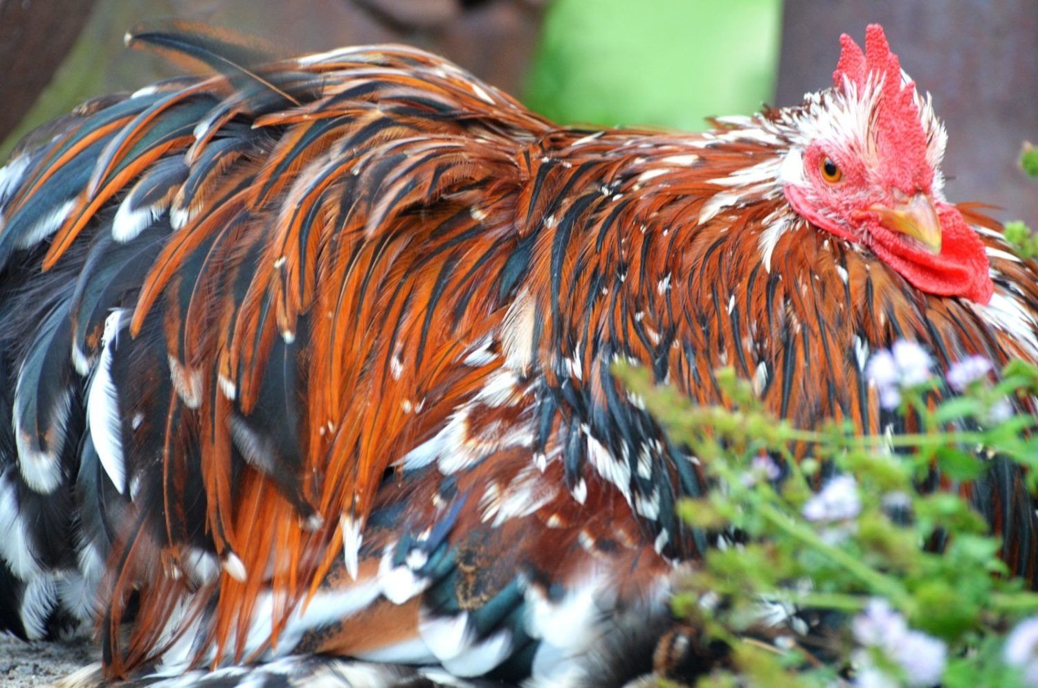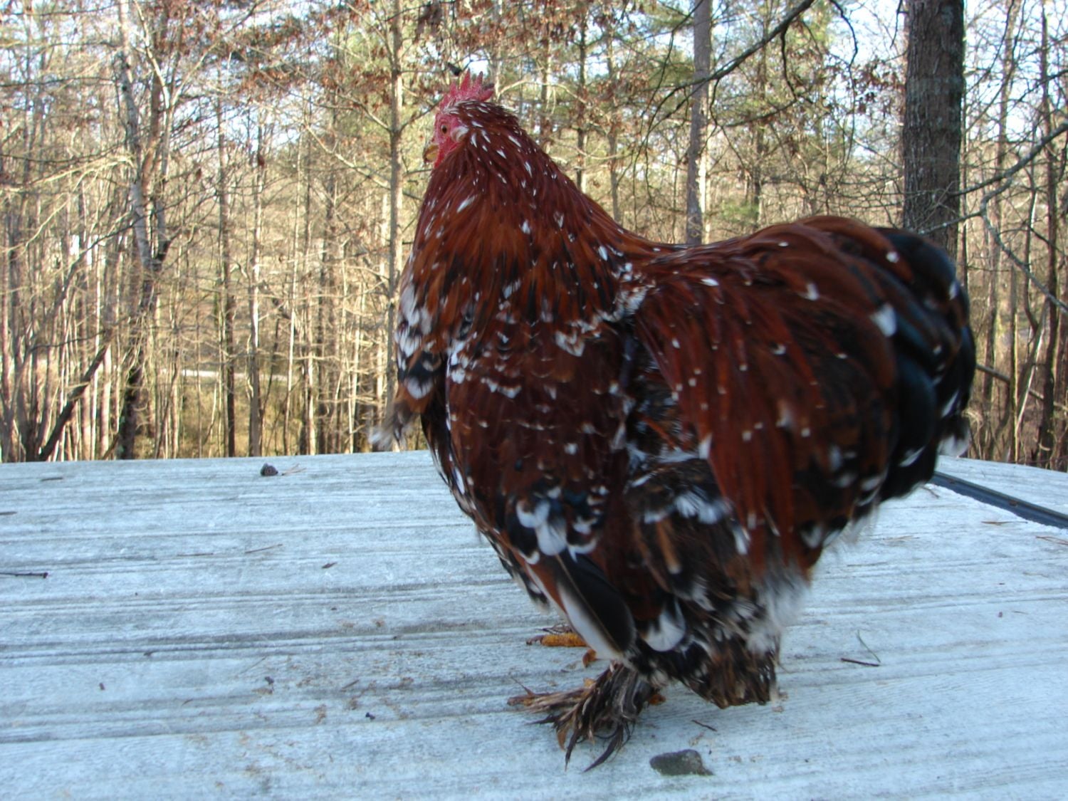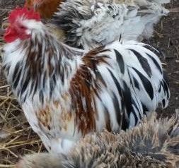 Here are a couple examples of the best patterned mille fleur I've managed to hatch. The hen is about 2 years old and is recovering from a molt. Even all filled out, her type is NOT great... but I've kept her around because of the breast flowers. The cockerel is this year's hatch and is split breasted. I have been dealing with that a lot. ...hoping to see less of it in 2016