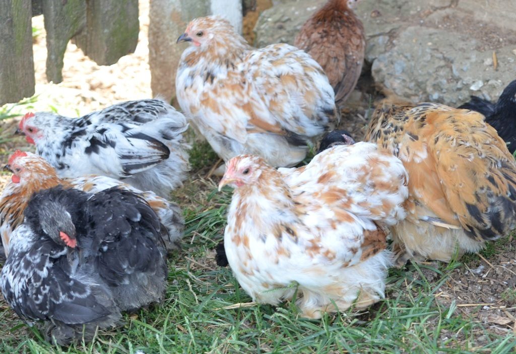 The pullet to the left is the start of blue mille fleur. The gals on the right are brassy black mottled to put back on BC and a splash mille project bird.