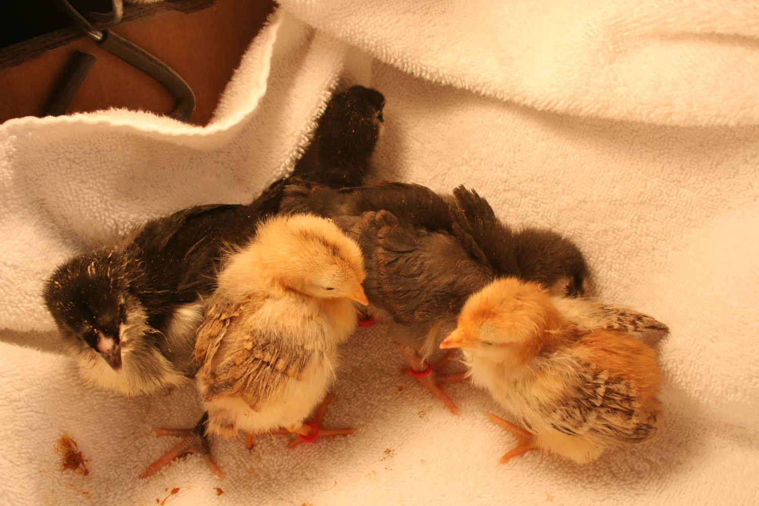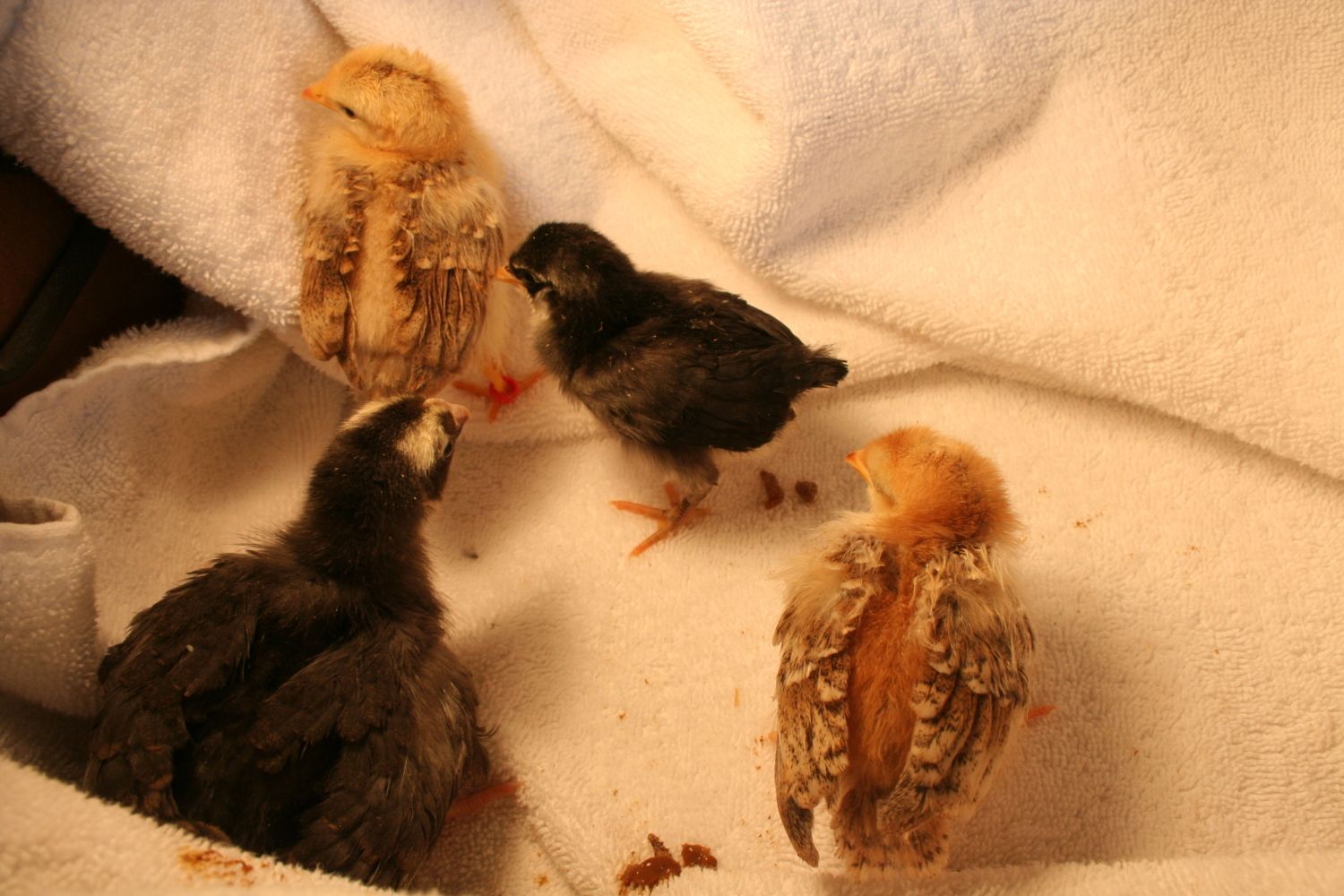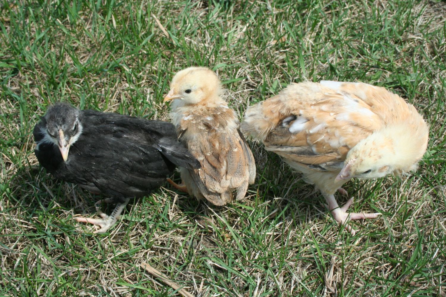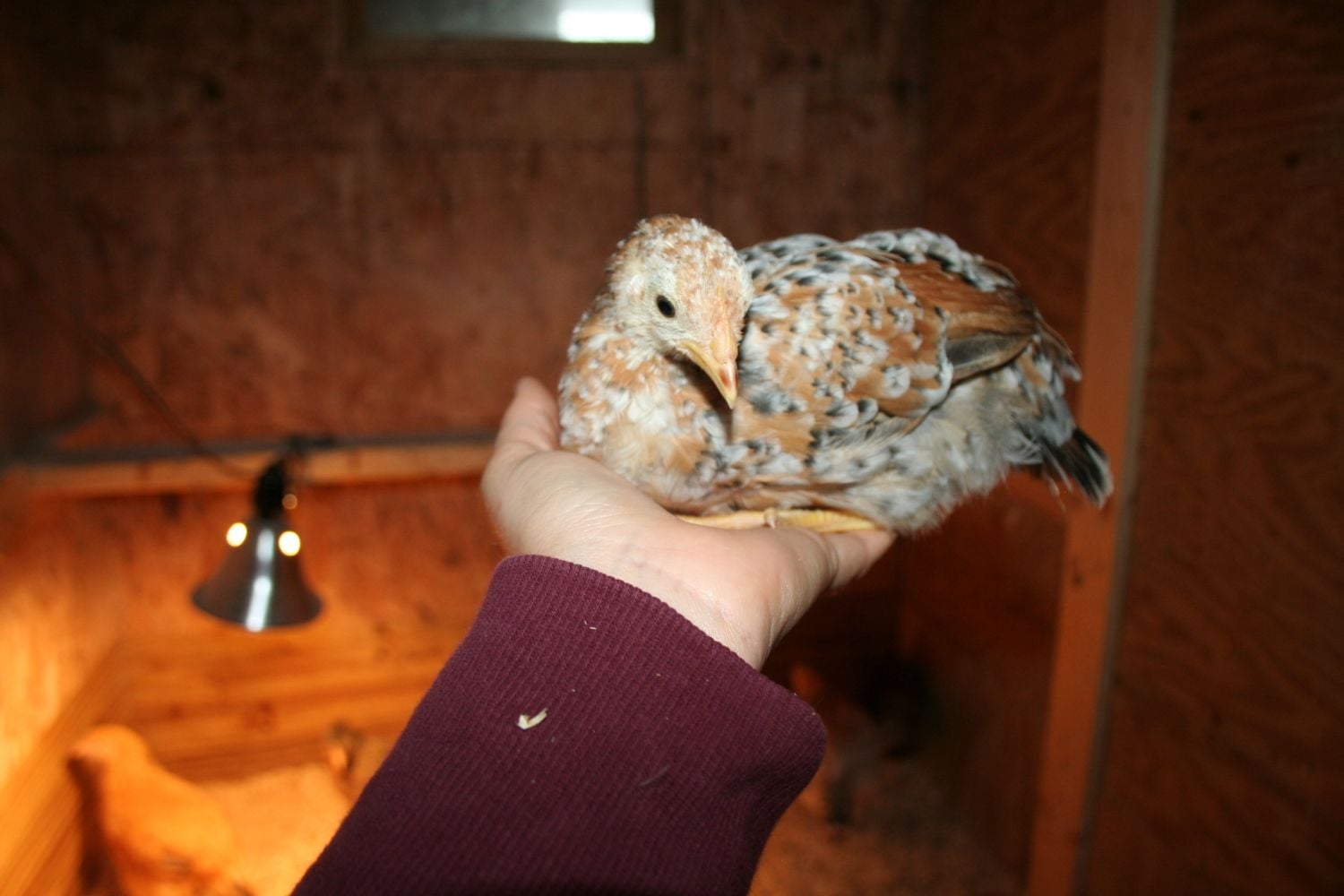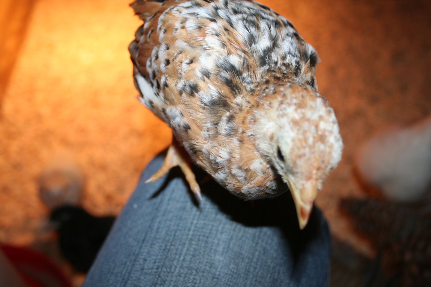 4-5 weeks old in middle next to bantam ameraucana on left and basque hen on right (all should be within1-2 weeks of each other):