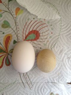 Question ... I have no idea what breed of duck we have. She is white and brown with orange feet. She started laying eggs 4 days ago and her eggs are about half the size of a chicken egg. Is this normal? Is there a breed of duck that lays small eggs? I haven't found anything on the internet yet so I thought maybe someone on here would know. Here is a picture of the egg from today. The white egg is our chicken egg and smaller brownish egg is from the duck. Thanks!
