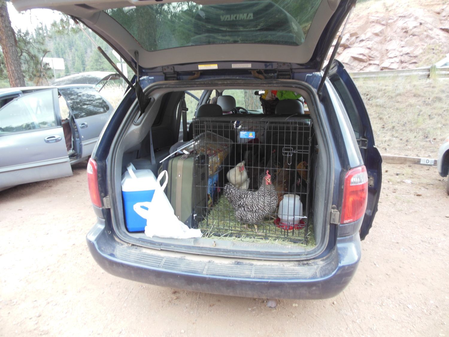Here are my eight rather unhappy big girls stuffed in a dog crate in the back of our other mini-van. One of my Easter eggers actually laid an egg somewhere between Woodland Park and Deckers. We drew some attention at the rest stop and I gave the egg to a man who was taking pictures of my flock-on-the-go.