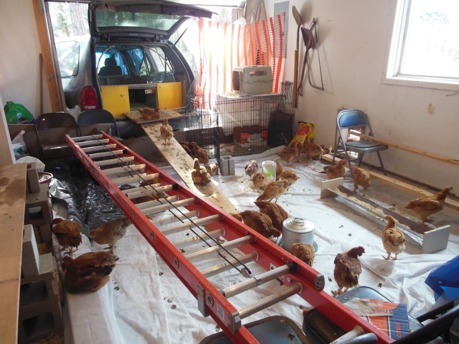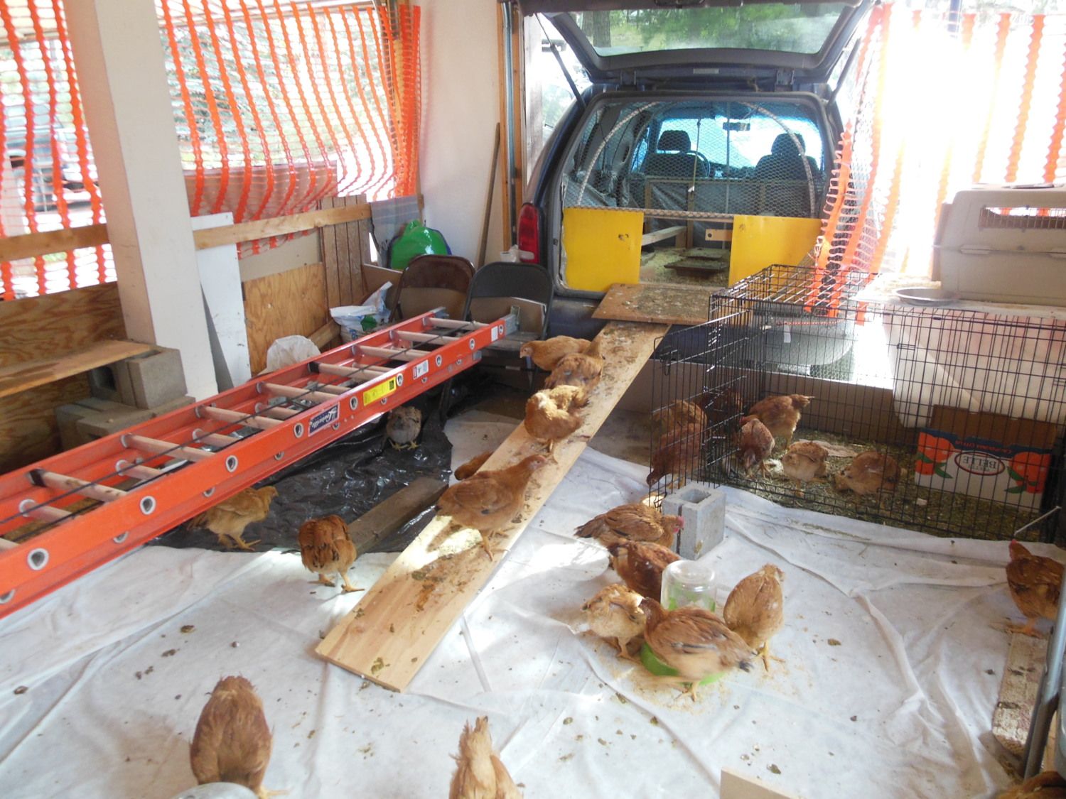 Another view showing how we've stapled plastic fencing up to keep chickens from flying into the other half of the garage.