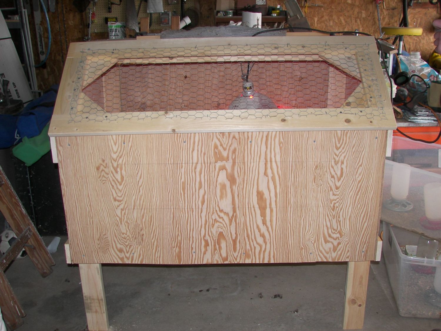 I kept it in said garage. Something like this could easily be insulated from the outside and the hatch covered part way with plastic or a canvas to help hold heat in. I had two hooks for lights so I was able to have two of them running during the coldest times. This wasn't insulated though and they did quite well. I could even fit two plastic totes in there to have two separate groups. It was handy until I outgrew it I am thinking I will be setting something similar up in the brooder house this fall for the next season. With the changes I am making with how much I will be hatching, I won't need the current set up I have out there. I do recommend lining brooders with something easier to clean that plywood though. Menards has plastic 4X8 sheets in white that are used in bathrooms for around sinks and tubs that I started using and can be scrubbed when it gets poopy.