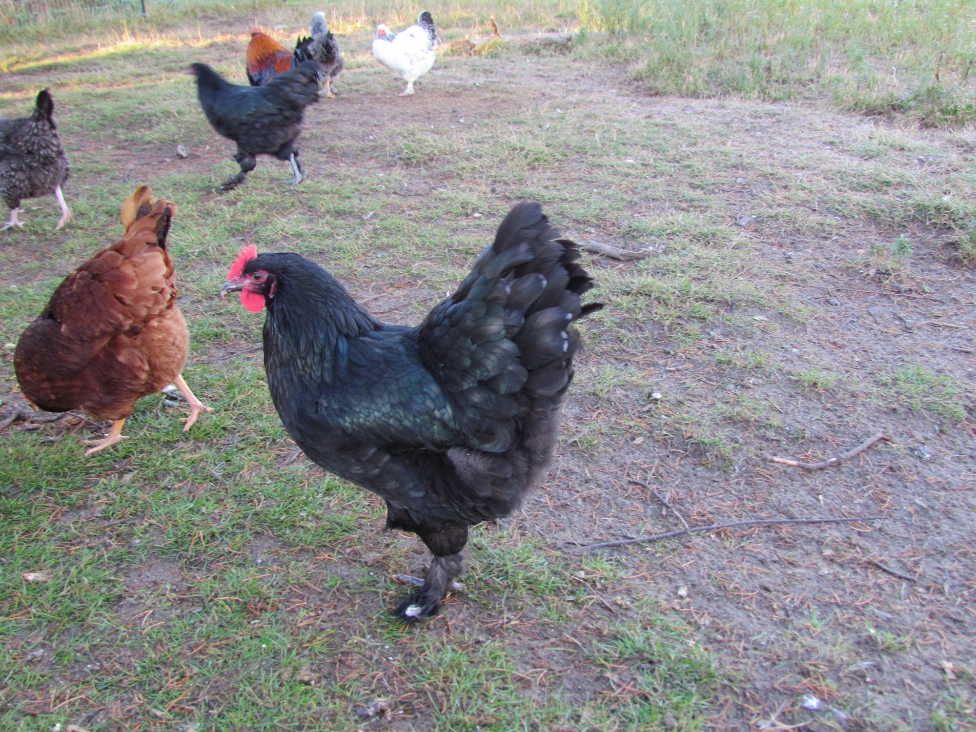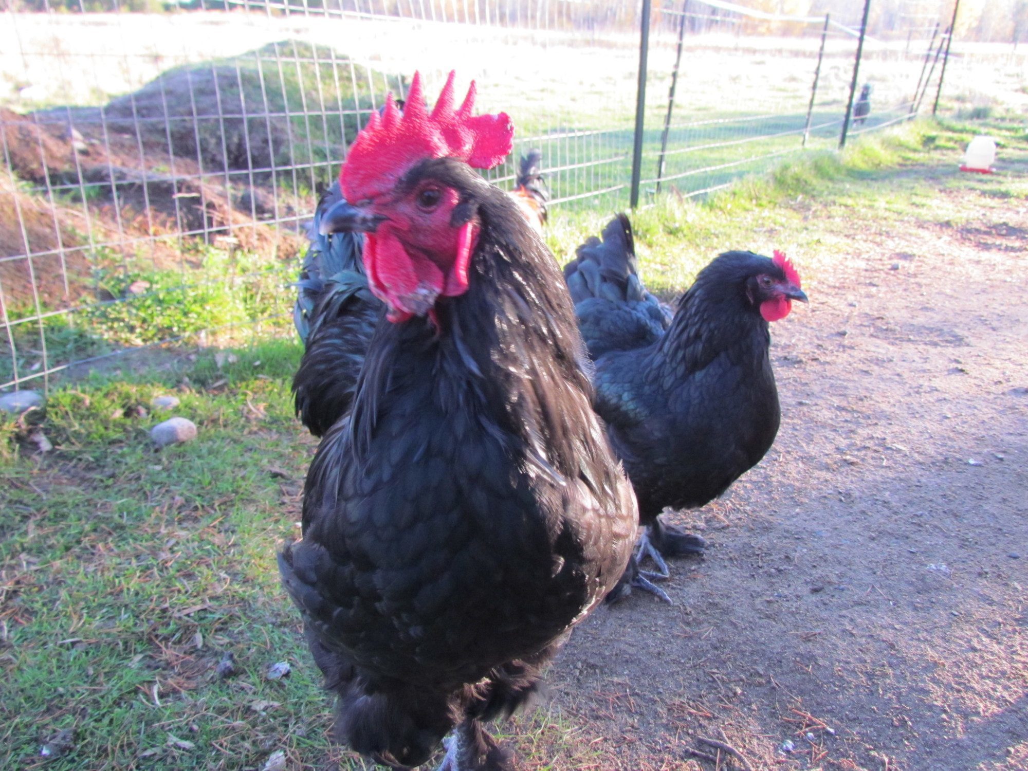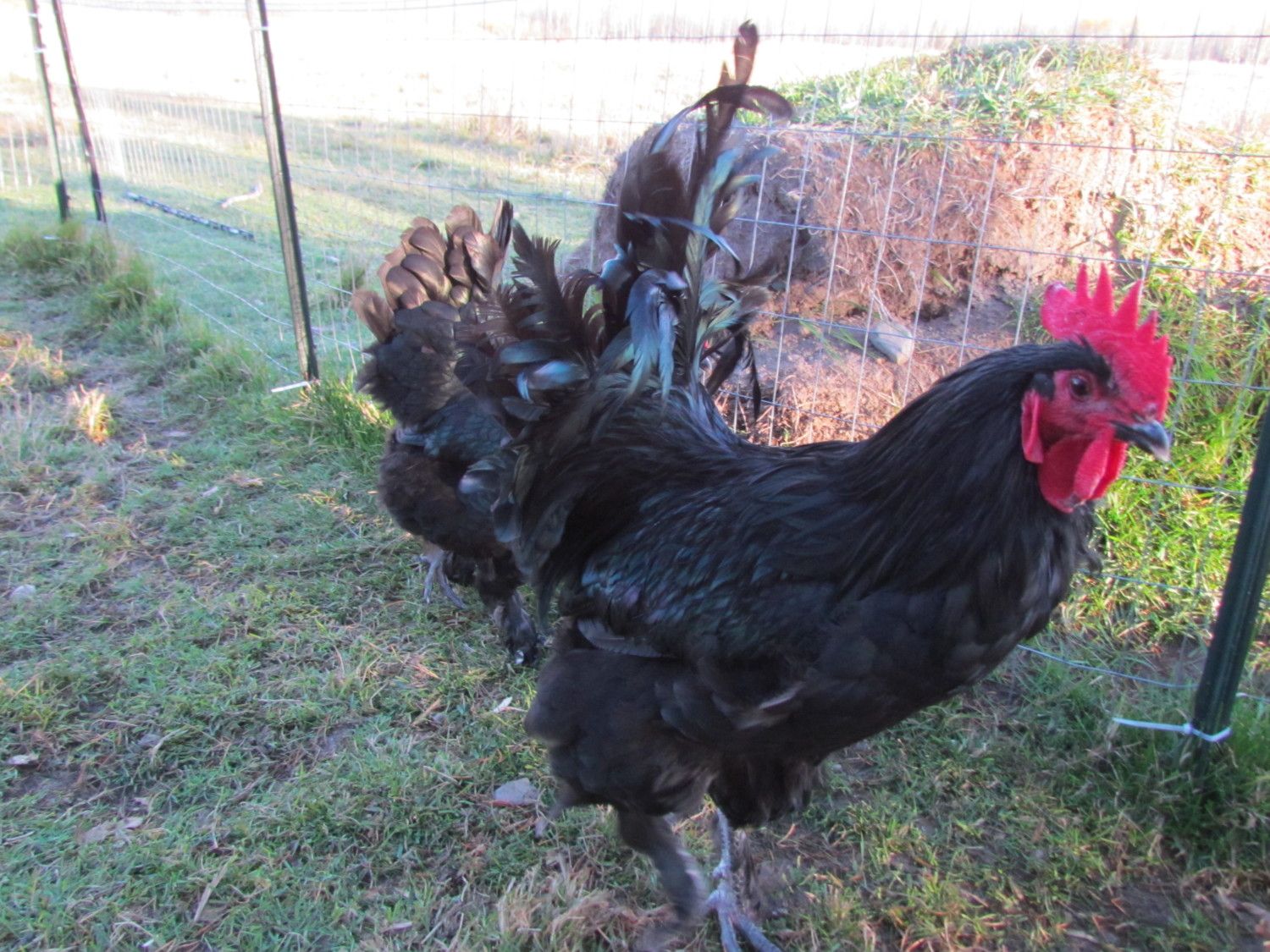 Roo and hen, Then hen below. Her bright red comb and wattles with her shiny black is SO pretty!