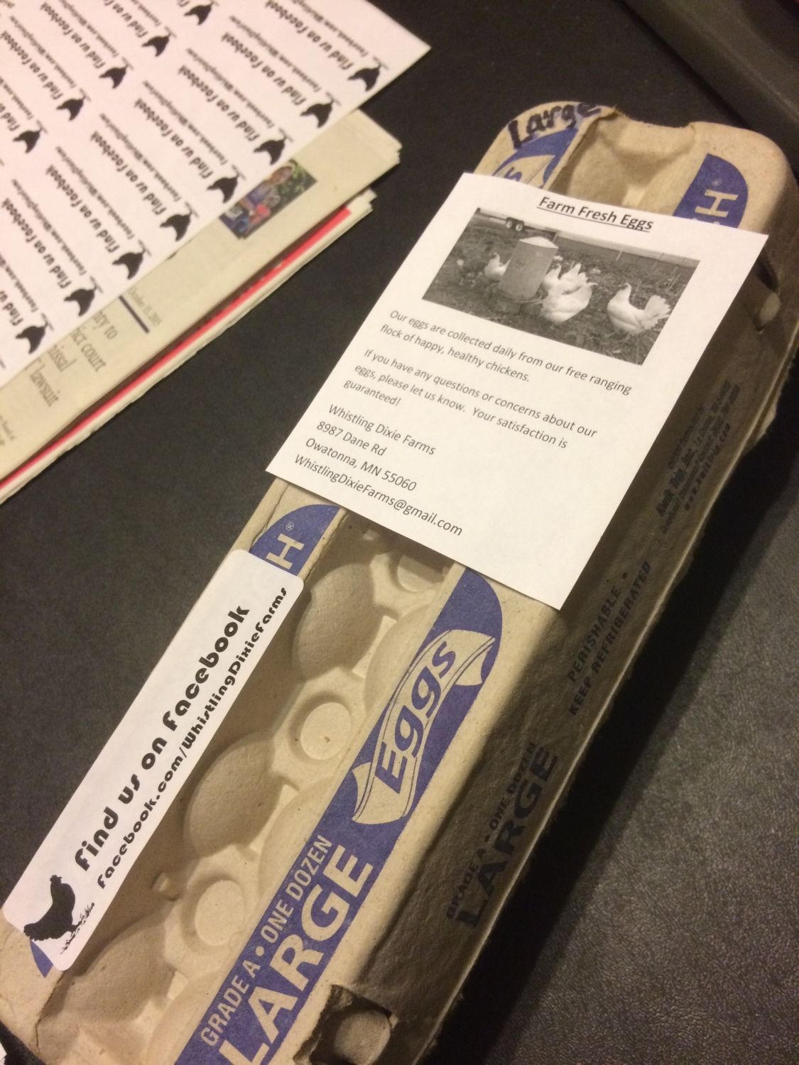 I took some eggs down to the cities as a host gift. And did a little write up on the hens with pictures on a post card describing personalities, breed etc. just a personal touch about the beings in my care that provided those eggs. They LOVEd it. To see the girls that laid the eggs. I know you have many more birds than I but you could take some cute stories about favorite hens or Conrad. People gobble up that stuff. Makes them feel good about buying those eggs too.