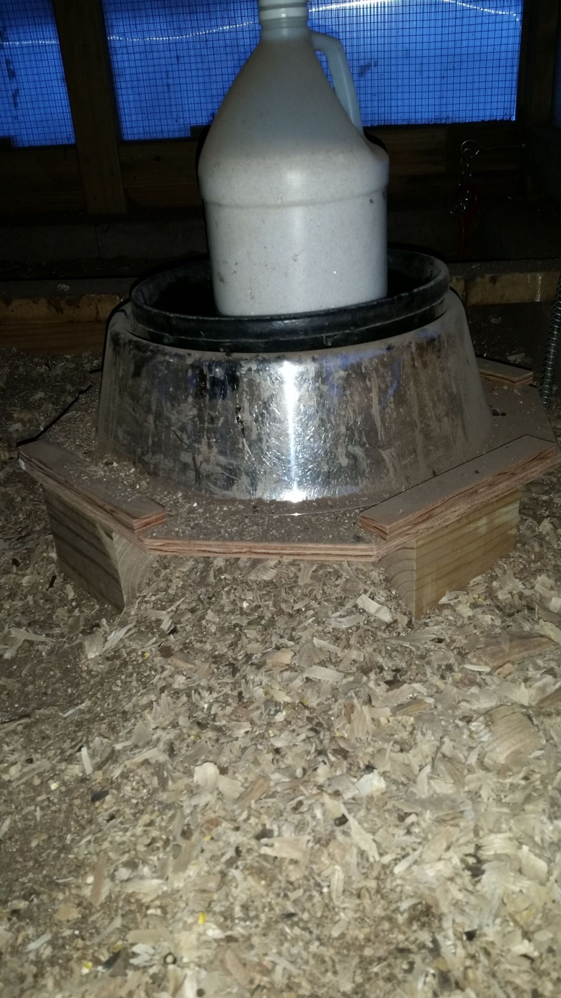 Quote: I raised mine up, it doesn't usually get too dirty in their water. i'll try and get a photo of the base I had DH make. I didn't want it to tip over, especially in the winter. I'll go take a photo in a few minutes when I lock the girls away for the night. I have the two heated waterers, this one, and the pail with horizontal nipples.