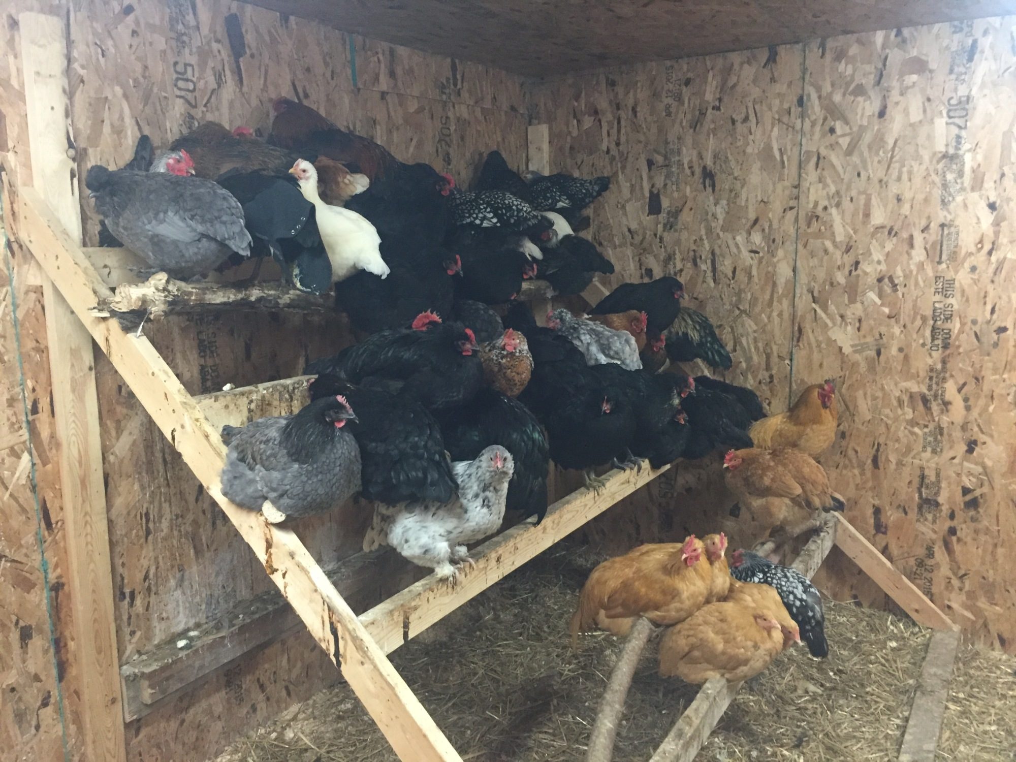 I have two roosts that are about 8ft long wall to wall. One is about 10in higher than the other. They, of course, like the higher roost and the corners are prime waterfront properties. However, now that we recently put in poop boards, they've all been hanging out in front of the nest boxes, which is really annoying. They're constantly bickering now. I think the poop boards scared them at first *sigh* Last night, I moved them all over to the roosts and they were still there this morning. Only the roosters moved. They like the far corner by the door and that's fine. I like a lot of other setups I've seen with ladder type roosts with a poop board underneath. I might do a little reworking this summer.
